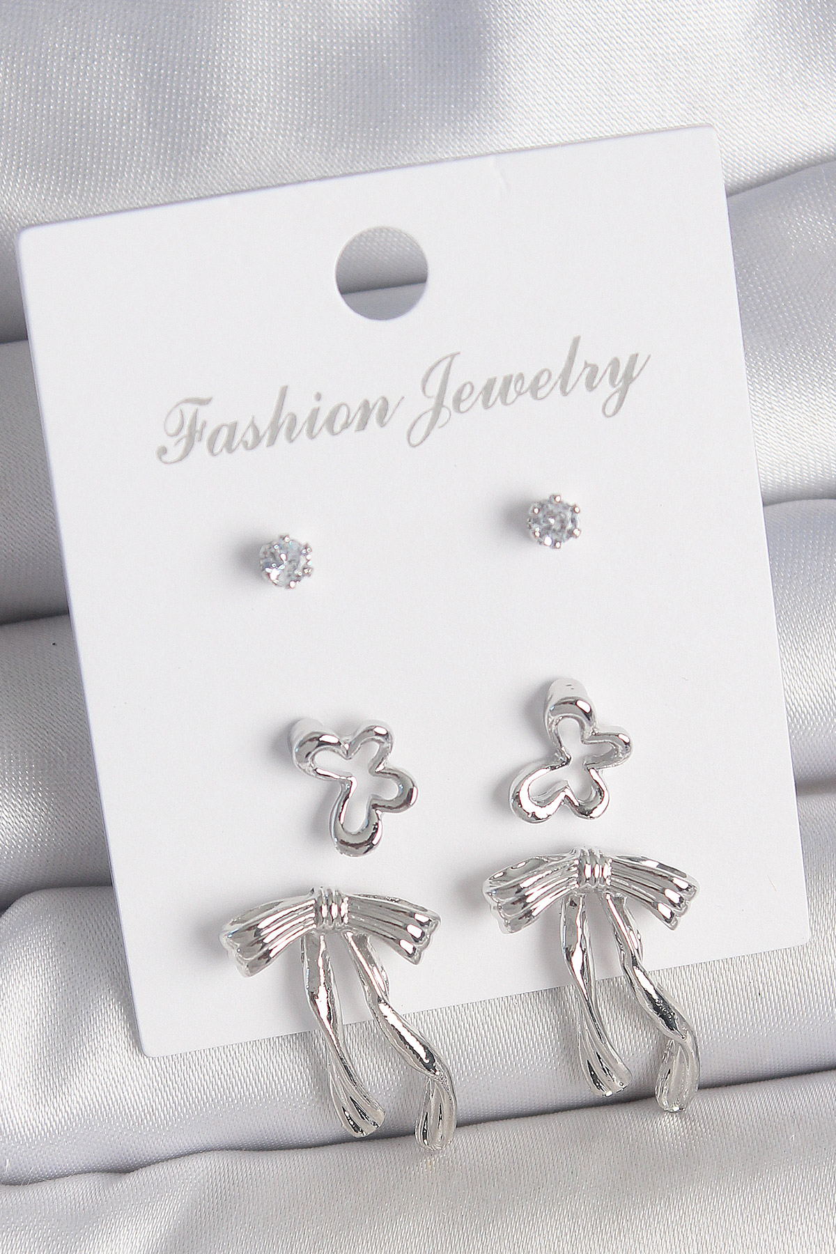 Pirinç Gümüş Renk Zirkon Taşlı Fiyonk Model Kelebek Detay 3 Çift Kadın Küpe - TJ-BKP10597