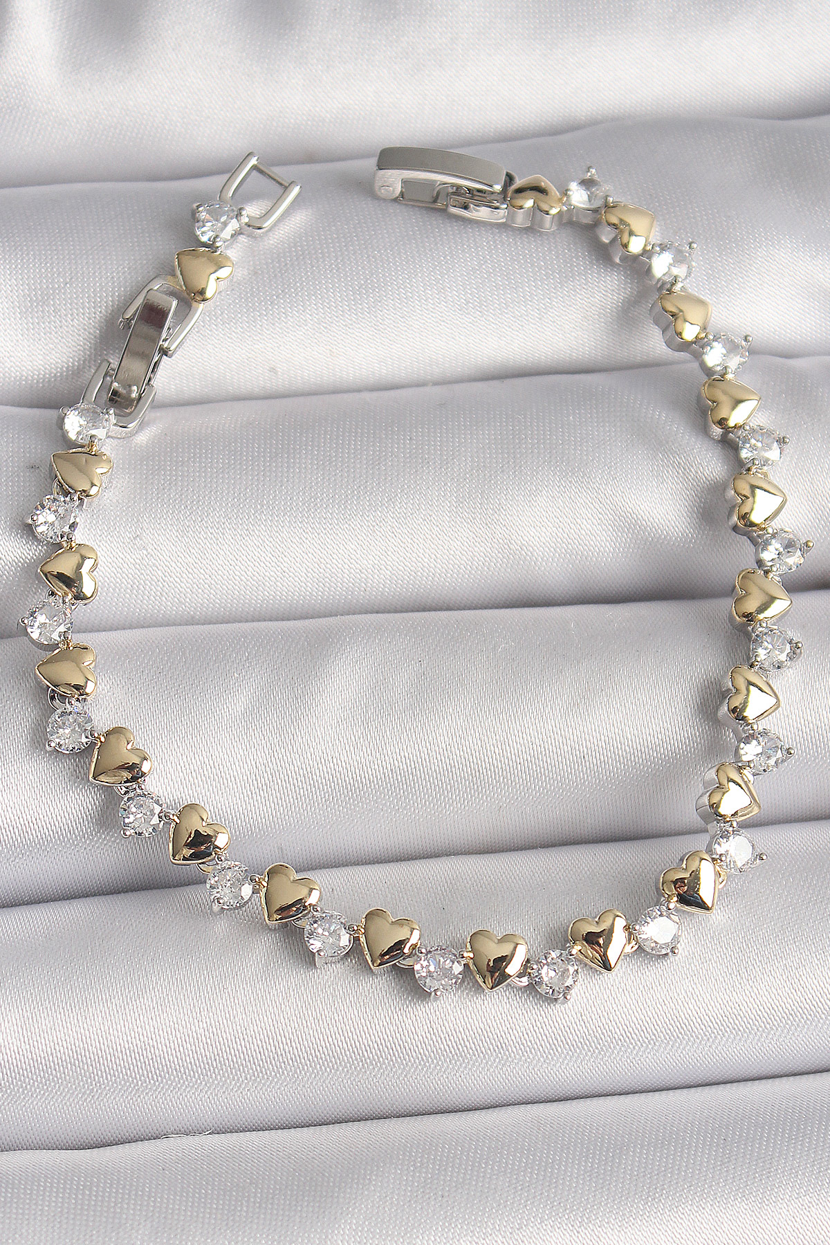Pirinç Gümüş Renk Zirkon Taşlı Gold Kalpli VIP Seri Kadın Bileklik - TJ-BB6714