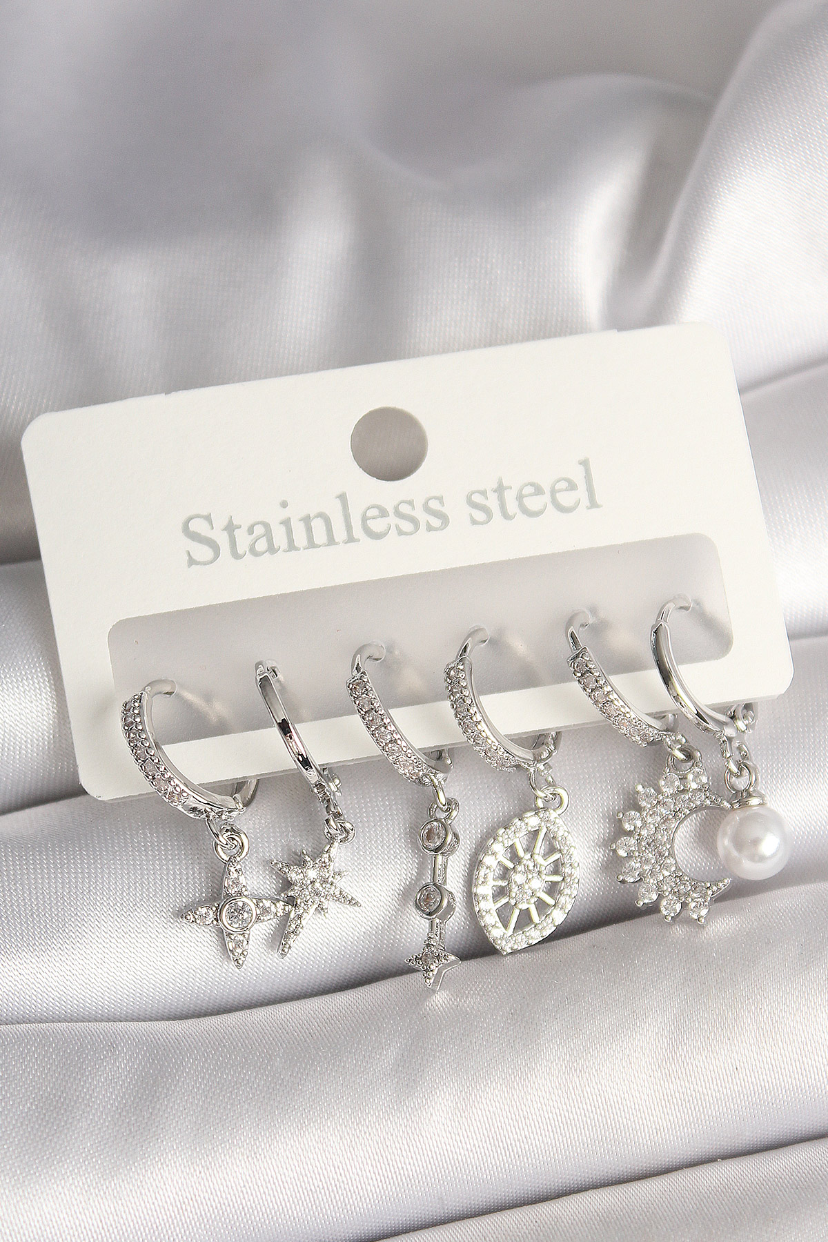 Pirinç Gümüş Renk Zirkon Taşlı Göz Figür İnci Detay Kadın Küpe Seti - TJ-BKP10427