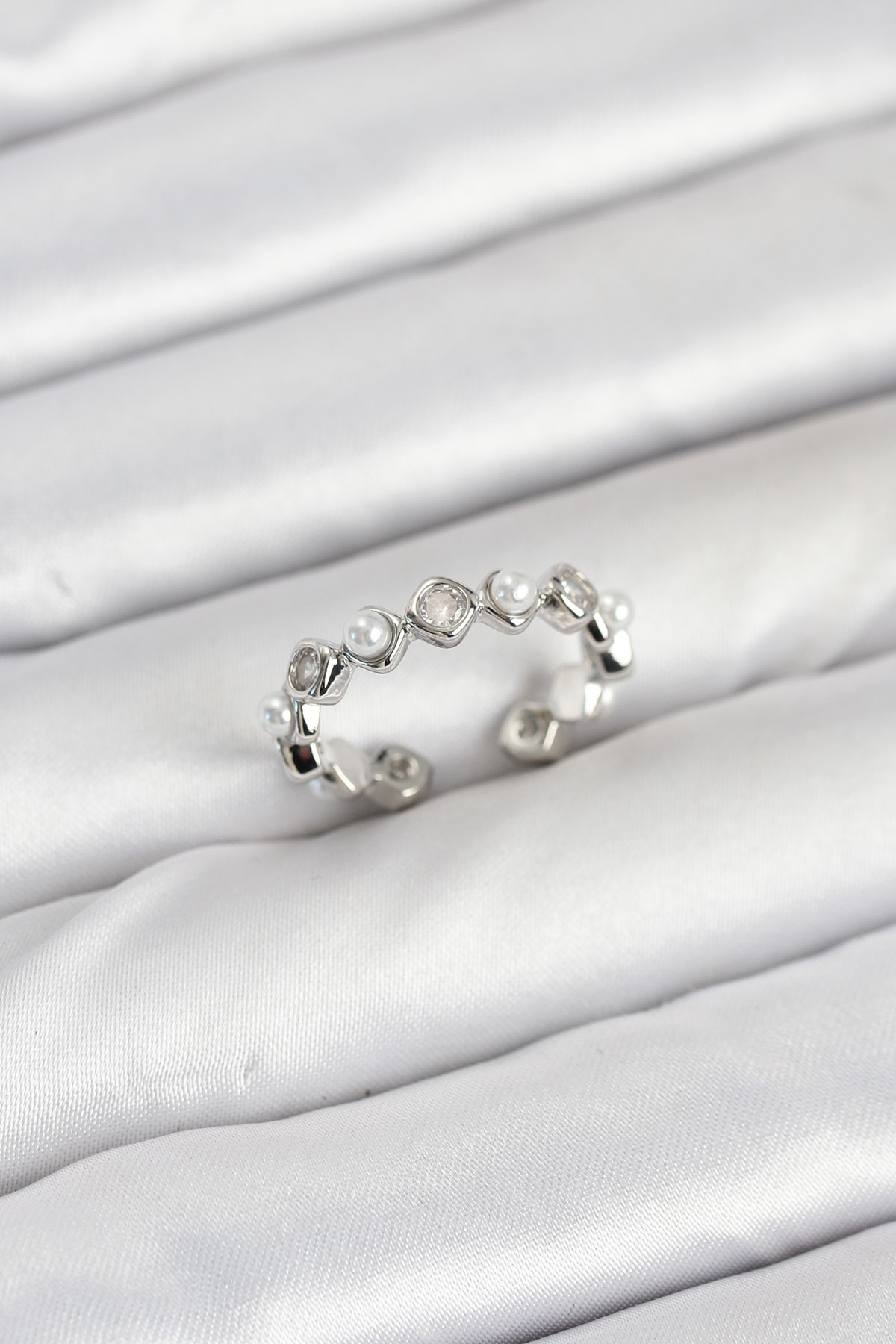 Pirinç Gümüş Renk Zirkon Taşlı İncili Kadın Yüzük - TJ-BYK3877