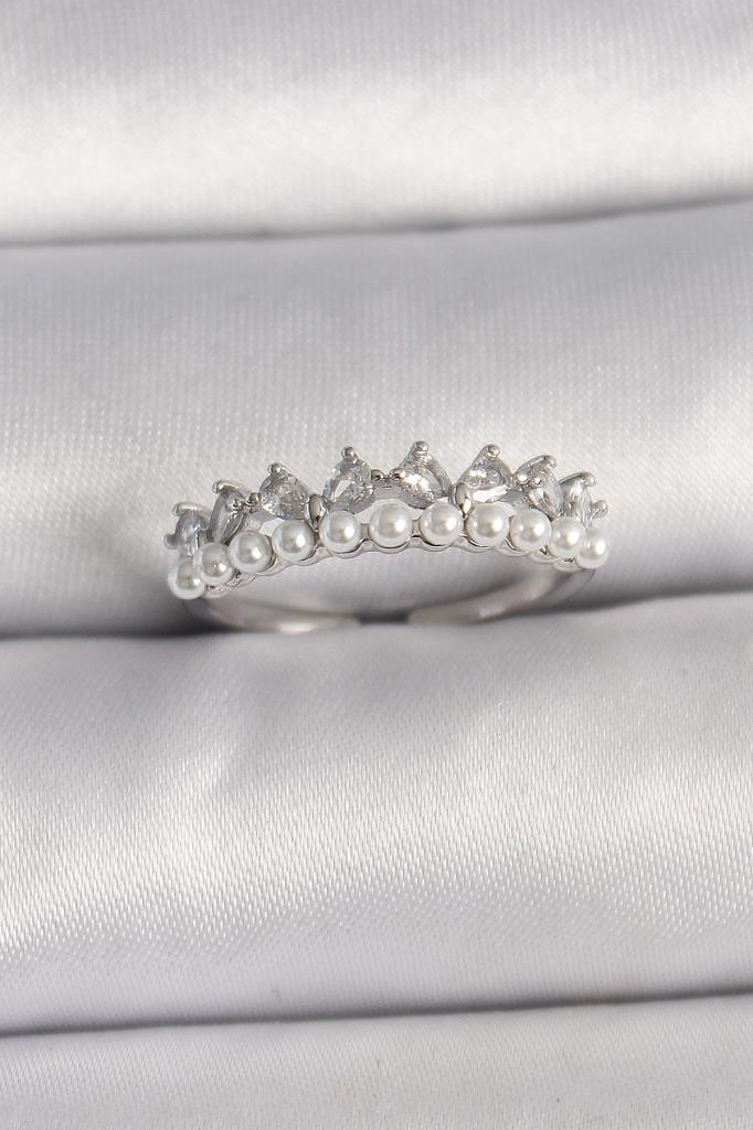 Pirinç Gümüş Renk Zirkon Taşlı İncili Taç Model Ayarlanabilir Kadın Yüzük - TJ-BYK3575
