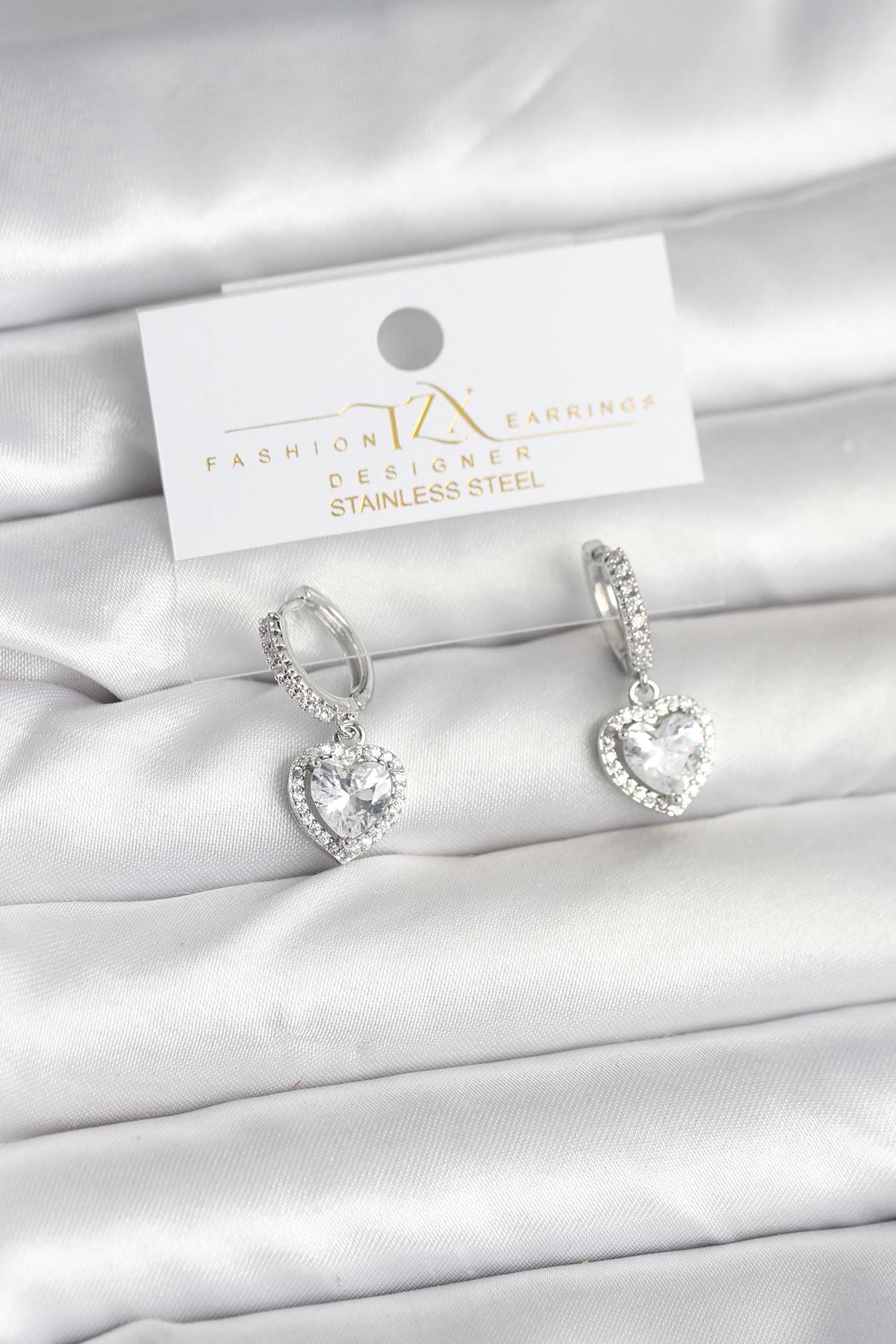 Pirinç Gümüş Renk Zirkon Taşlı Kalp Model Kadın Küpe - TJ-BKP11396