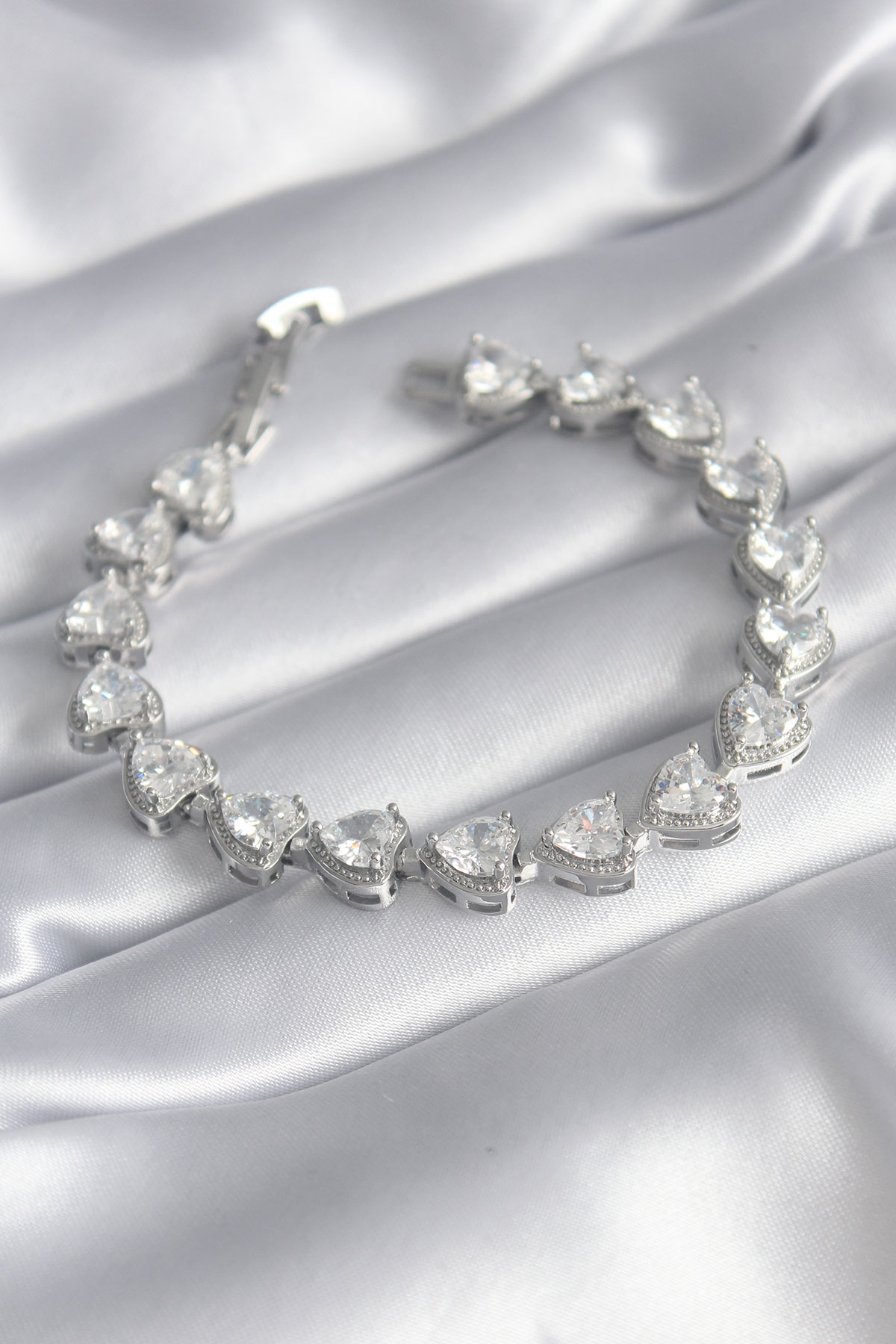 Pirinç Gümüş Renk Zirkon Taşlı Kalp Model VIP Seri Kadın Bileklik - TJ-BB5844