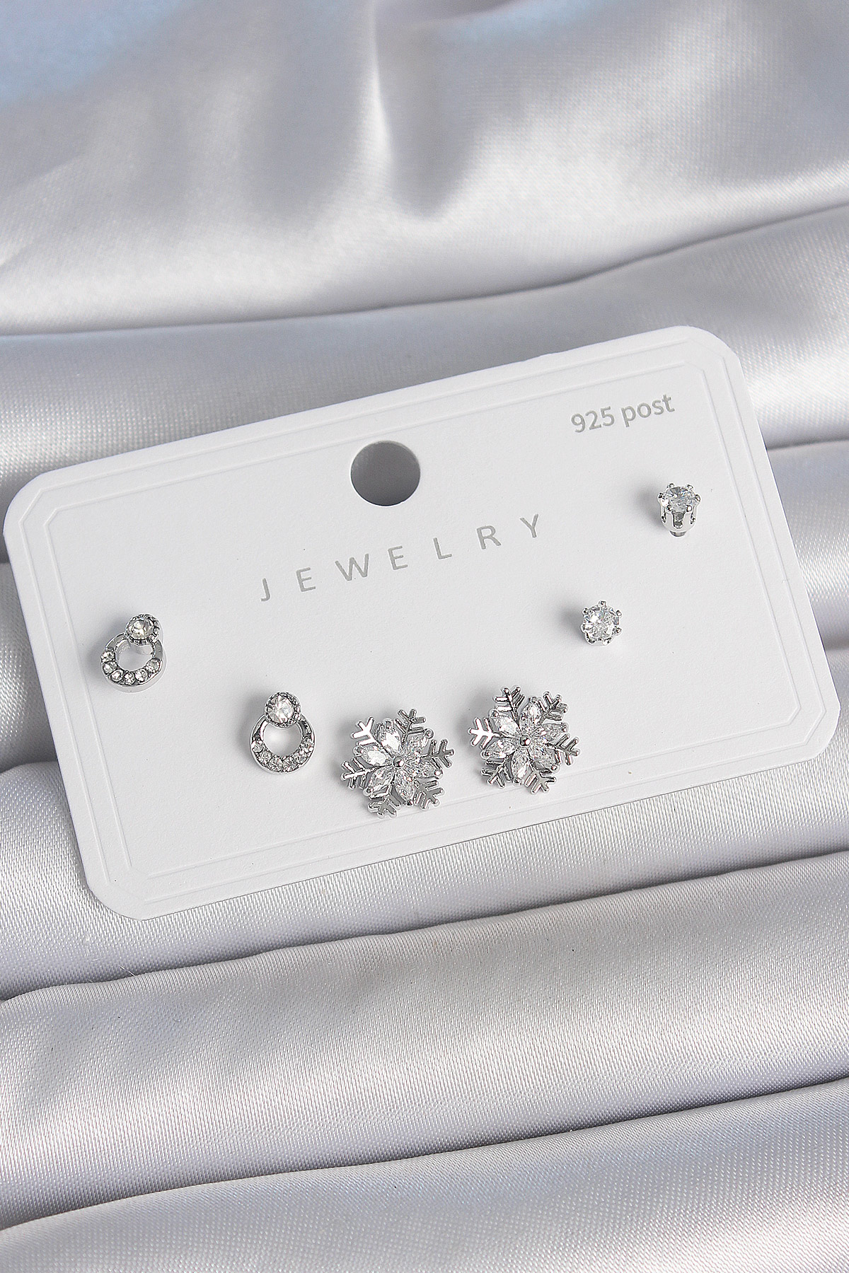 Pirinç Gümüş Renk Zirkon Taşlı Kar Tanesi Model 925 Ayar Gümüş Çivi Kadın Küpe Seti - TJ-BKP10483
