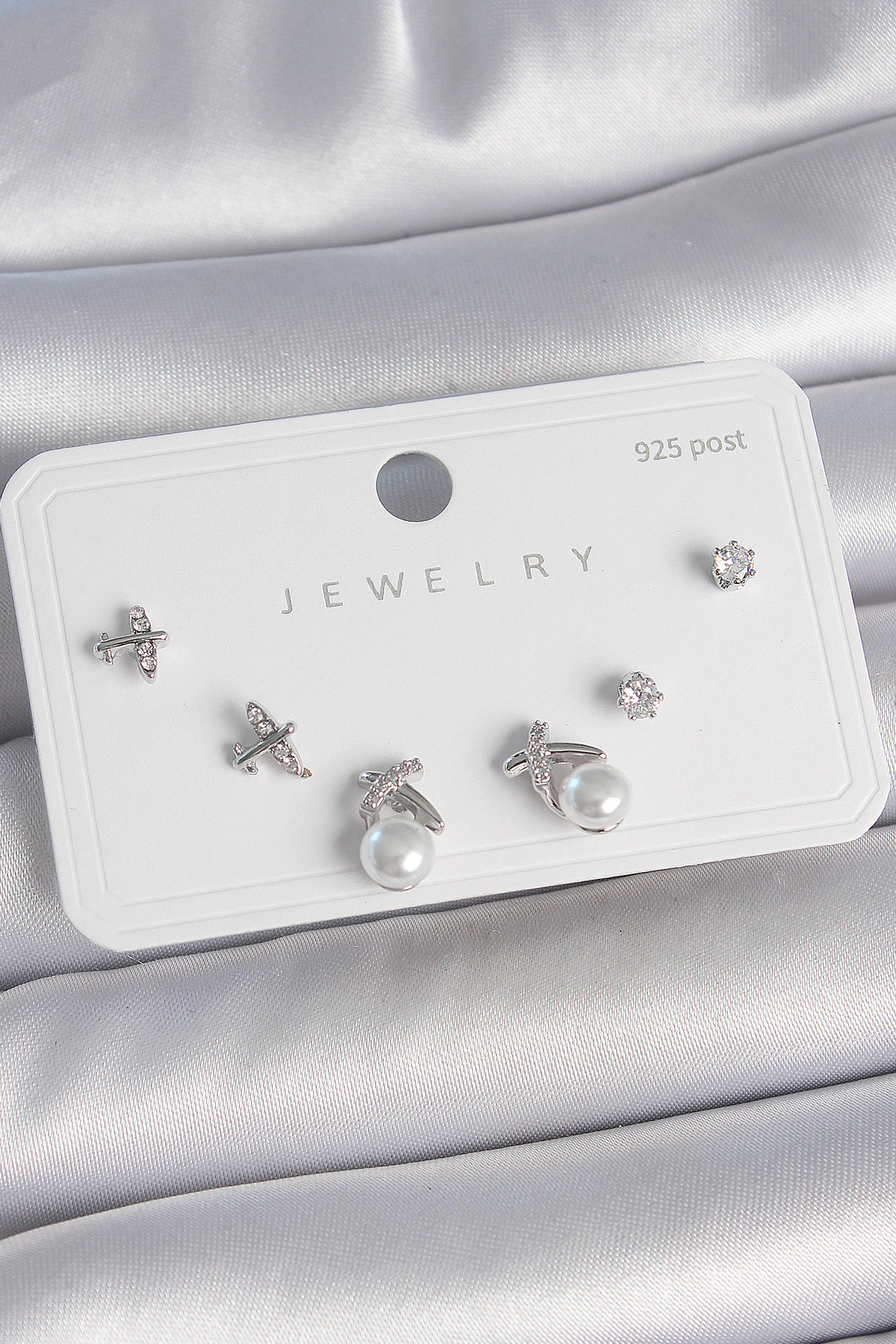 Pirinç Gümüş Renk Zirkon Taşlı Kelebek Model İnci Detay 925 Ayar Gümüş Çivi Kadın Küpe Seti - TJ-BKP10479