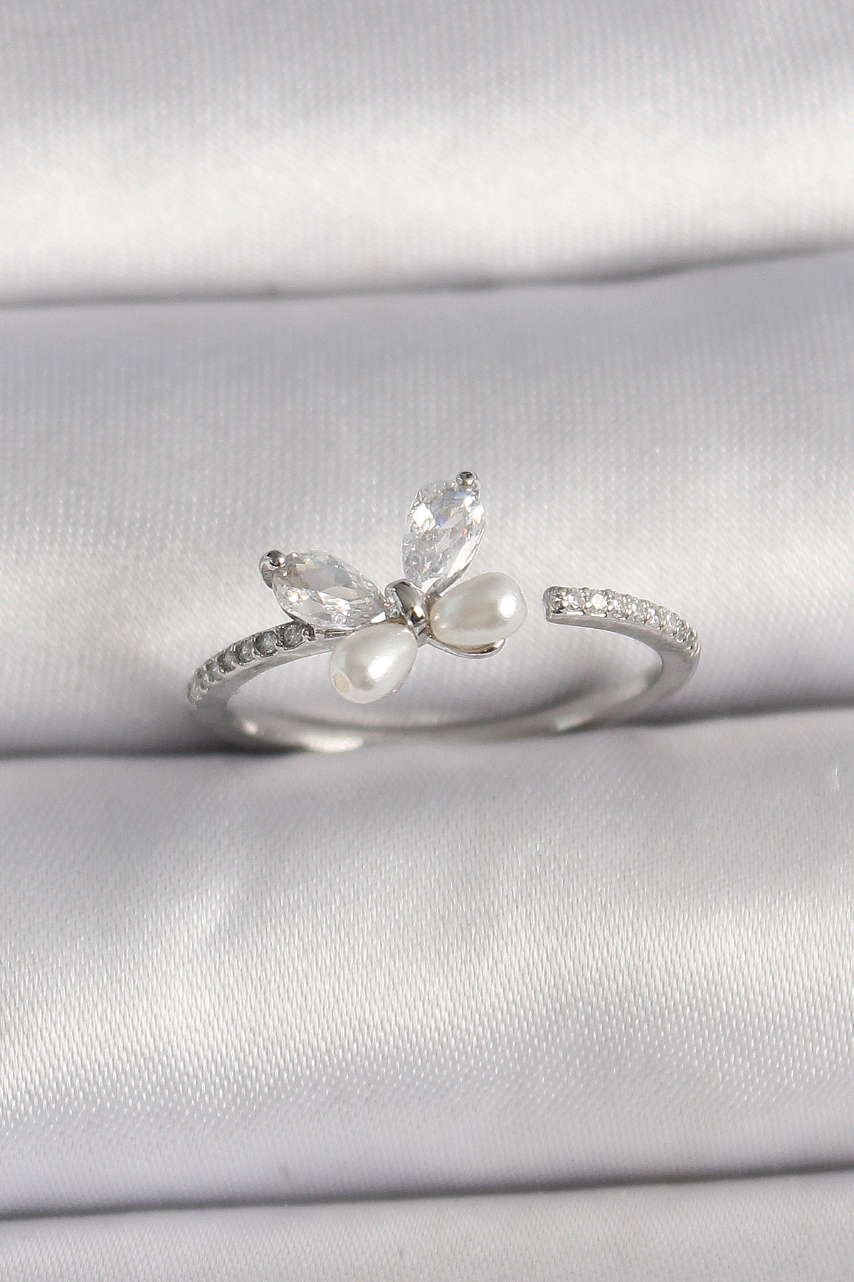 Pirinç Gümüş Renk Zirkon Taşlı Kelebek Model İnci Detaylı Ayarlanabilir Yüzük - TJ-BYK3558