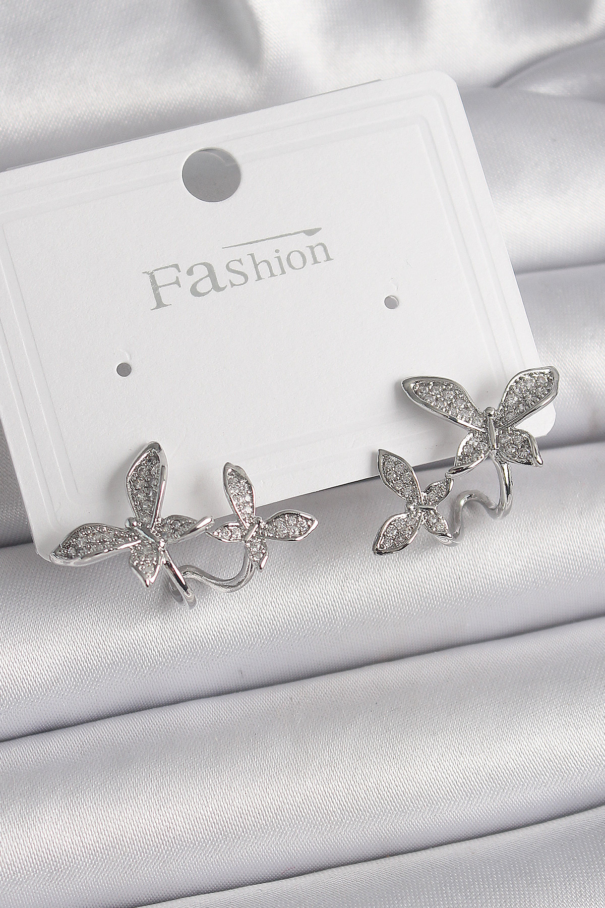 Pirinç Gümüş Renk Zirkon Taşlı Kelebek Model Kadın Küpe - TJ-BKP9839