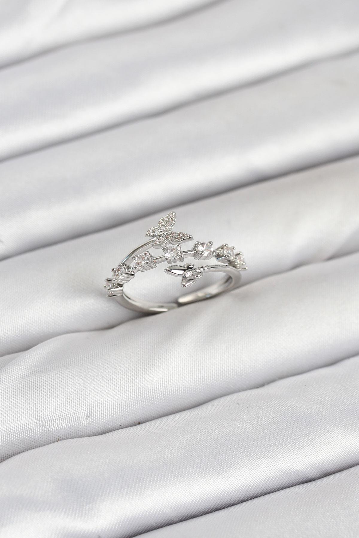 Pirinç Gümüş Renk Zirkon Taşlı Kelebek Model Kadın Yüzük - TJ-BYK3851
