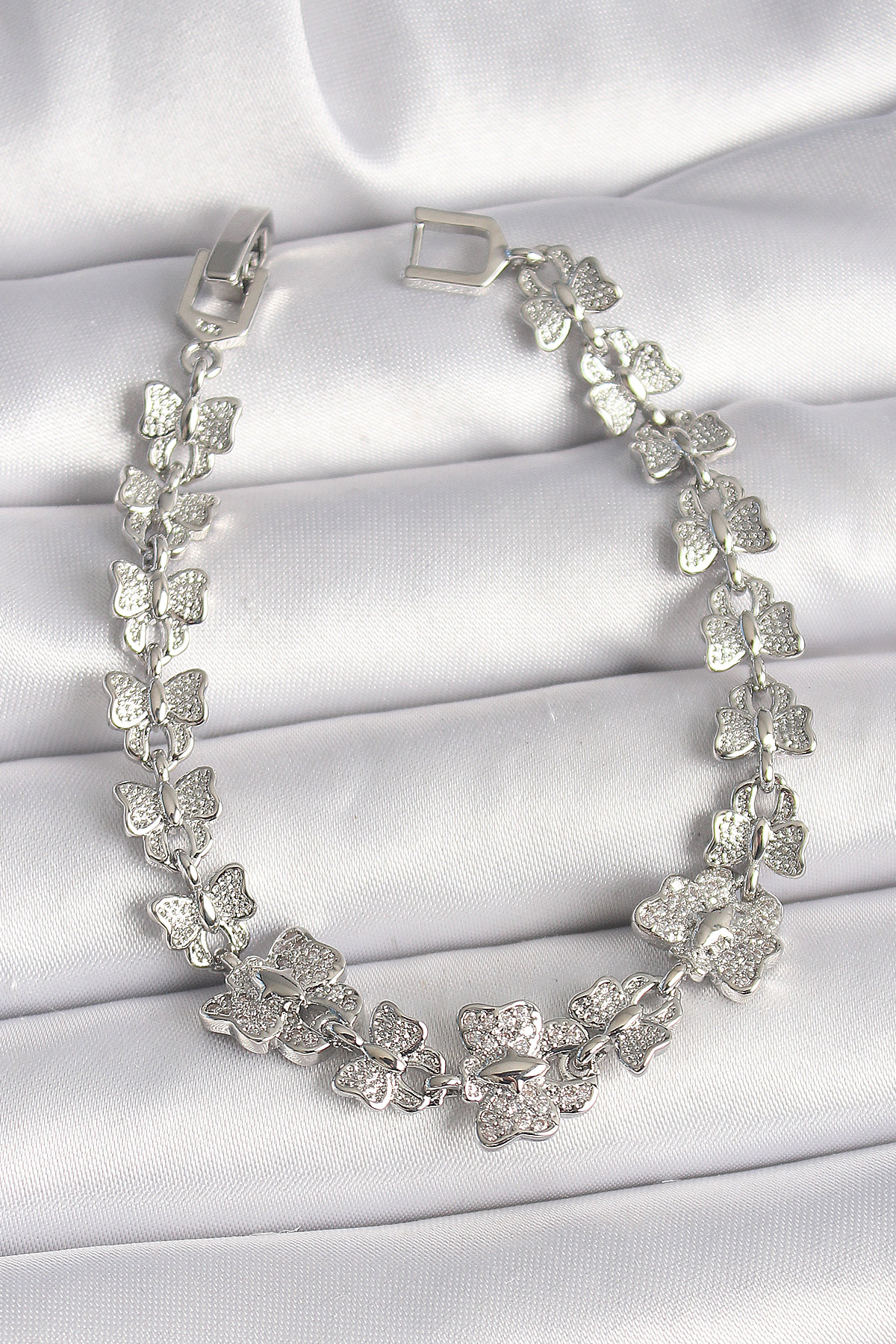 Pirinç Gümüş Renk Zirkon Taşlı Kelebek Model Zincir Kadın Bileklik - TJ-BB6835
