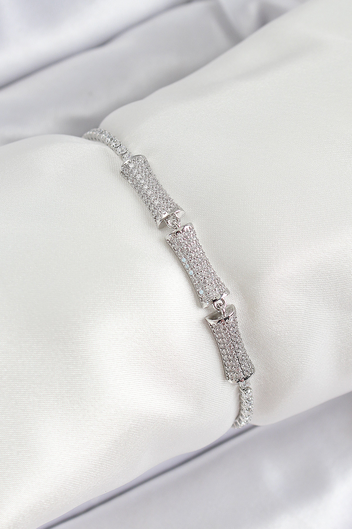 Pirinç Gümüş Renk Zirkon Taşlı Kemik Model Kadın Bileklik - TJ-BB7071