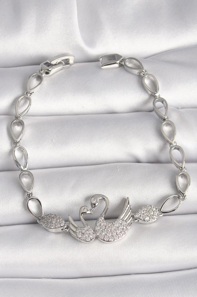 Pirinç Gümüş Renk Zirkon Taşlı Kuğu Figür Damla Zincir Model Kadın Bileklik - TJ-BB6850
