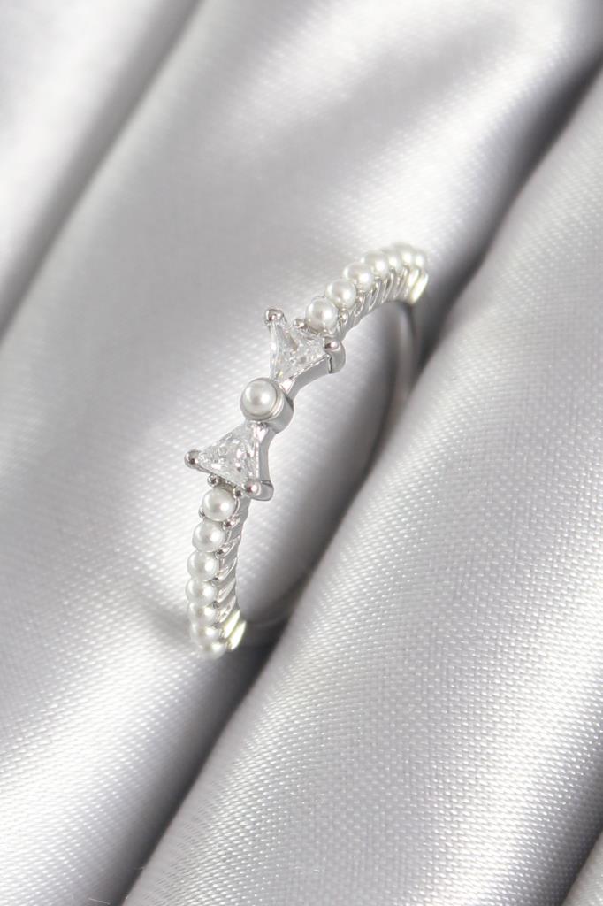 Pirinç Gümüş Renk Zirkon Taşlı Kurdele Model İnci Detay Kadın Yüzük - TJ-BYK3060