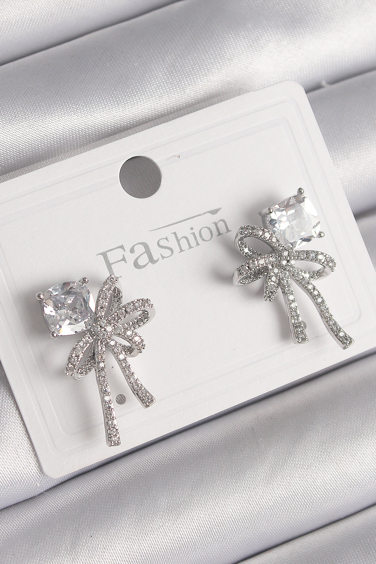 Pirinç Gümüş Renk Zirkon Taşlı Kurdele Model Kadın Küpe - TJ-BKP9775