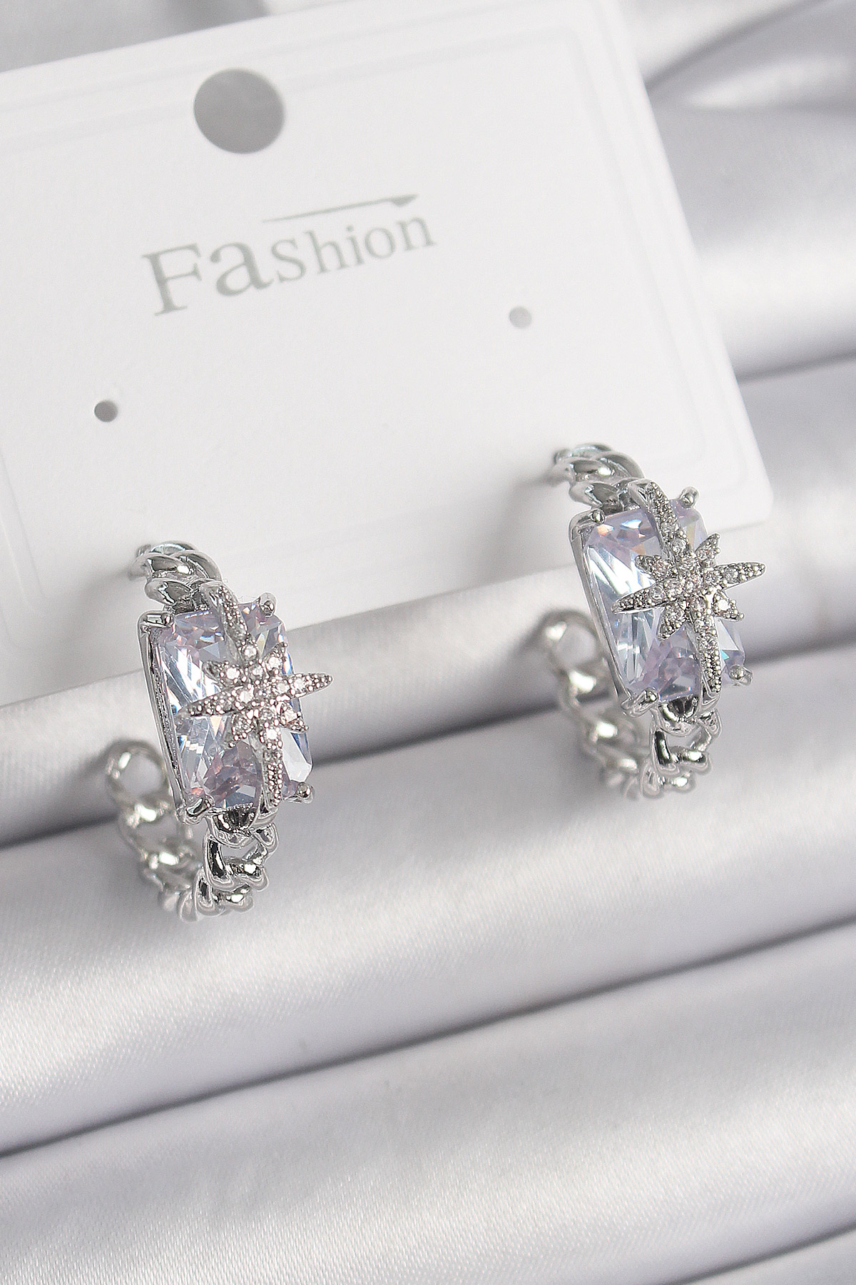 Pirinç Gümüş Renk Zirkon Taşlı Kutup Yıldız İşleme Detay Kadın Küpe - TJ-BKP9857