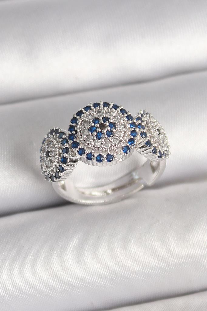 Pirinç Gümüş Renk Zirkon Taşlı Nazar Boncuk Model Ayarlanabilir Kadın Yüzük - BYK3699