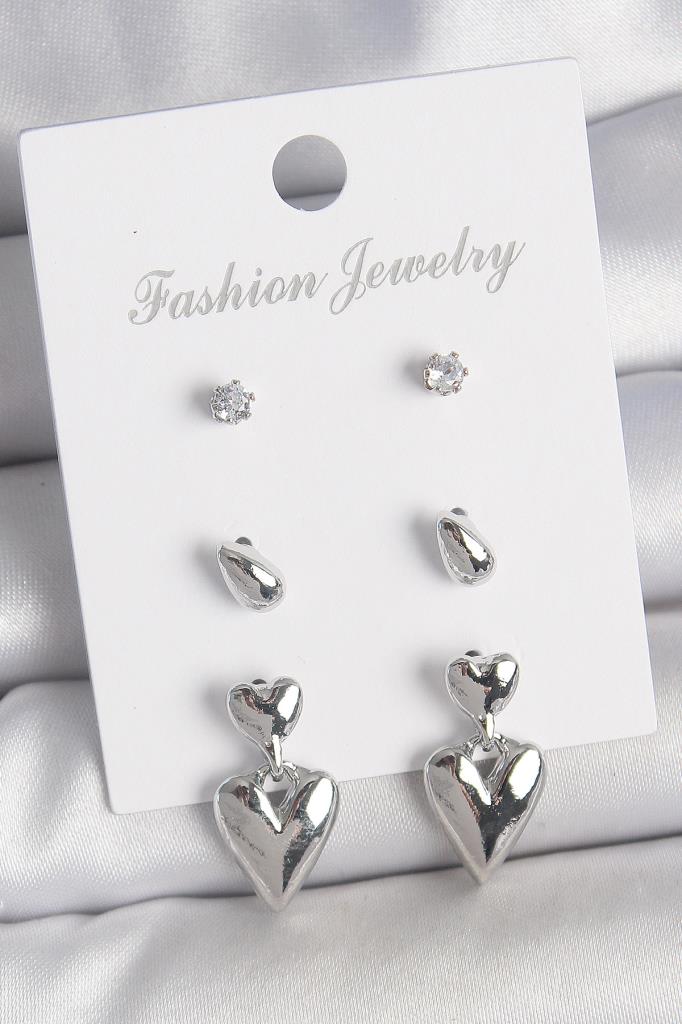 Pirinç Gümüş Renk Zirkon Taşlı Sallantılı Kalp Model 3 Çift Kadın Küpe Seti - BKP10592