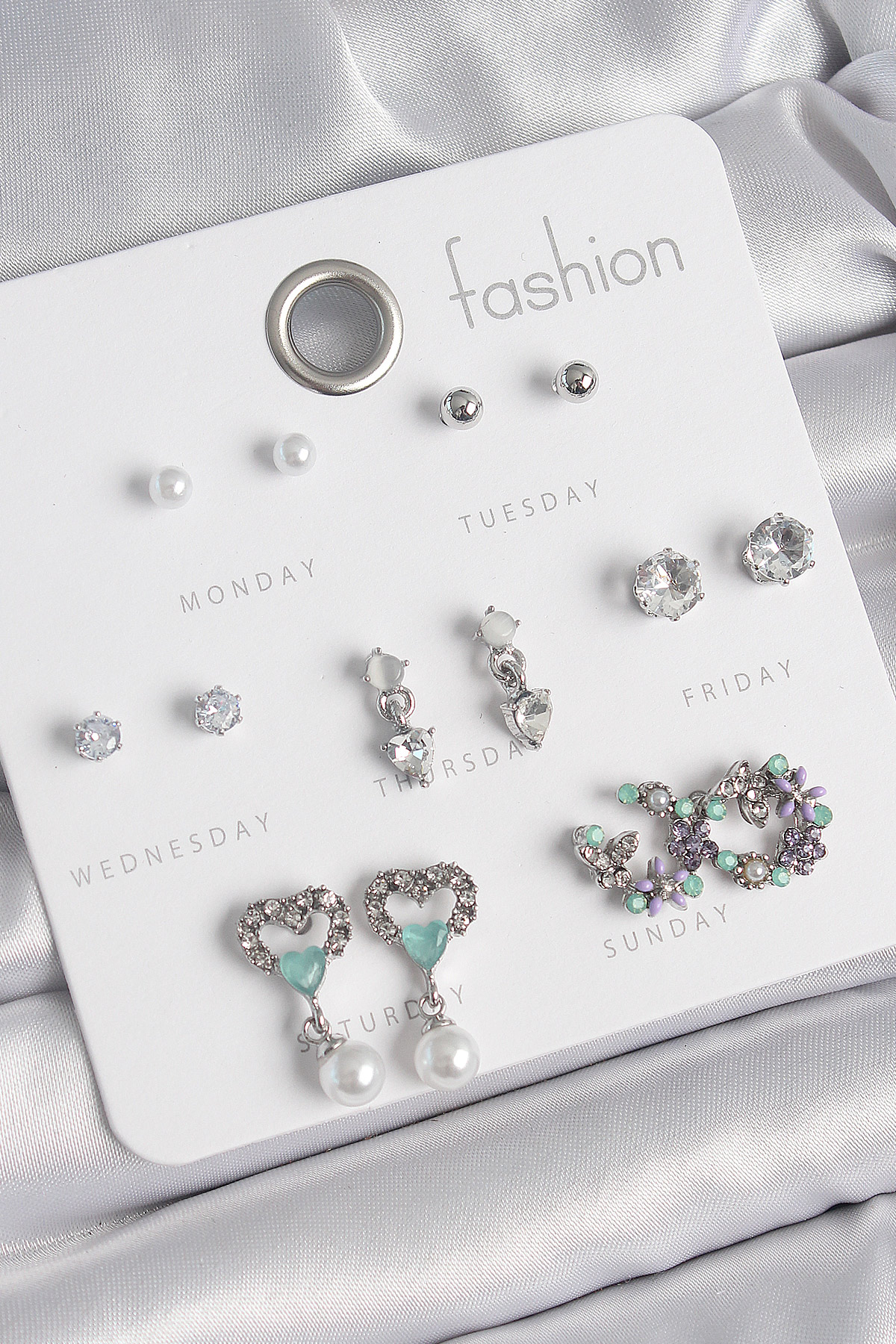 Pirinç Gümüş Renk Zirkon Taşlı Sallantılı Kalp Model Çiçek Detay 7 Çift Kadın Küpe Seti - TJ-BKP10546