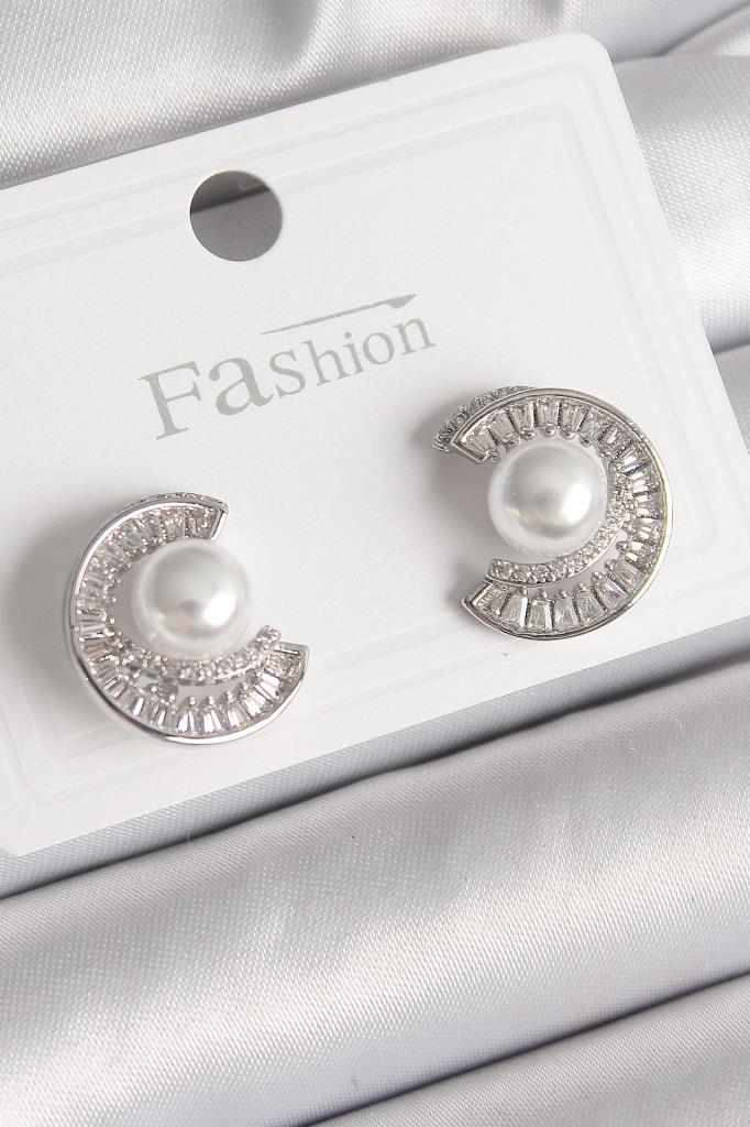 Pirinç Gümüş Renk Zirkon Taşlı Salyangoz Model İnci Detay Kadın Küpe - TJ-BKP9785