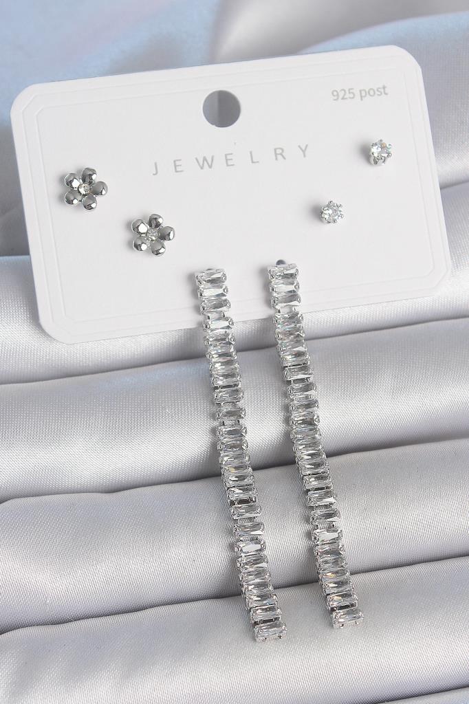 Pirinç Gümüş Renk Zirkon Taşlı Su Yolu Model Çiçek Detay 925 Ayar Gümüş Çivi Kadın Küpe Seti - TJ-BKP10497