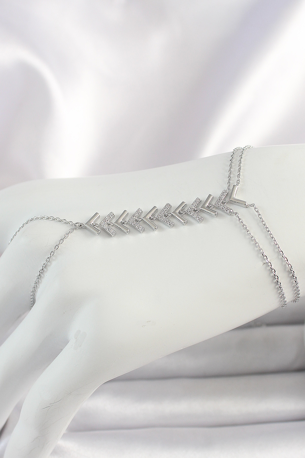 Pirinç Gümüş Renk Zirkon Taşlı V Model Kadın Şahmeran - TJ-SN630