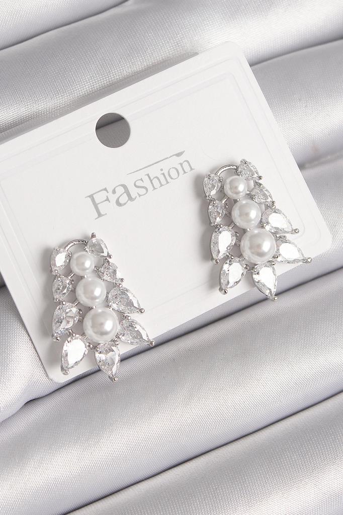 Pirinç Gümüş Renk Zirkon Taşlı Yaprak Model İnci Detay Kadın Küpe - TJ-BKP9799
