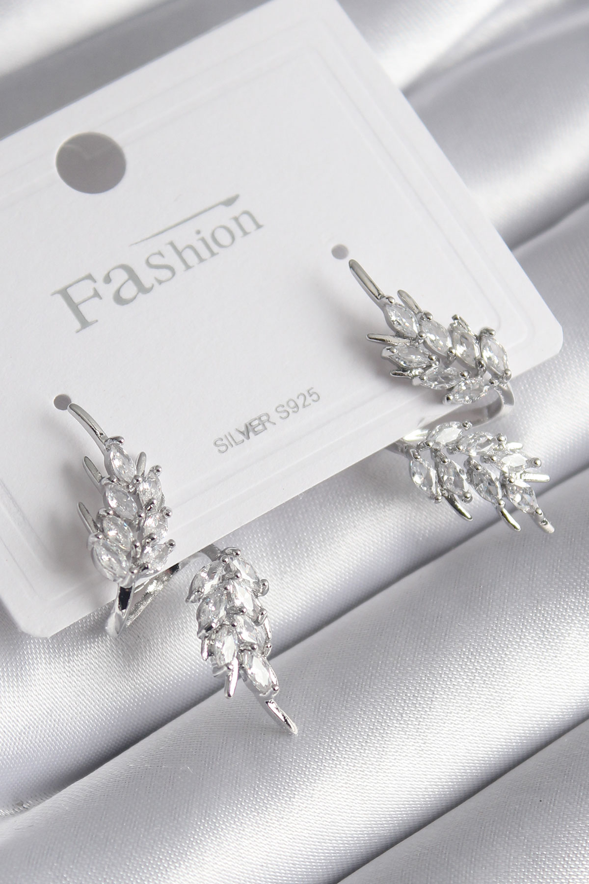 Pirinç Gümüş Renk Zirkon Taşlı Yaprak Model Kadın Küpe - TJ-BKP8608