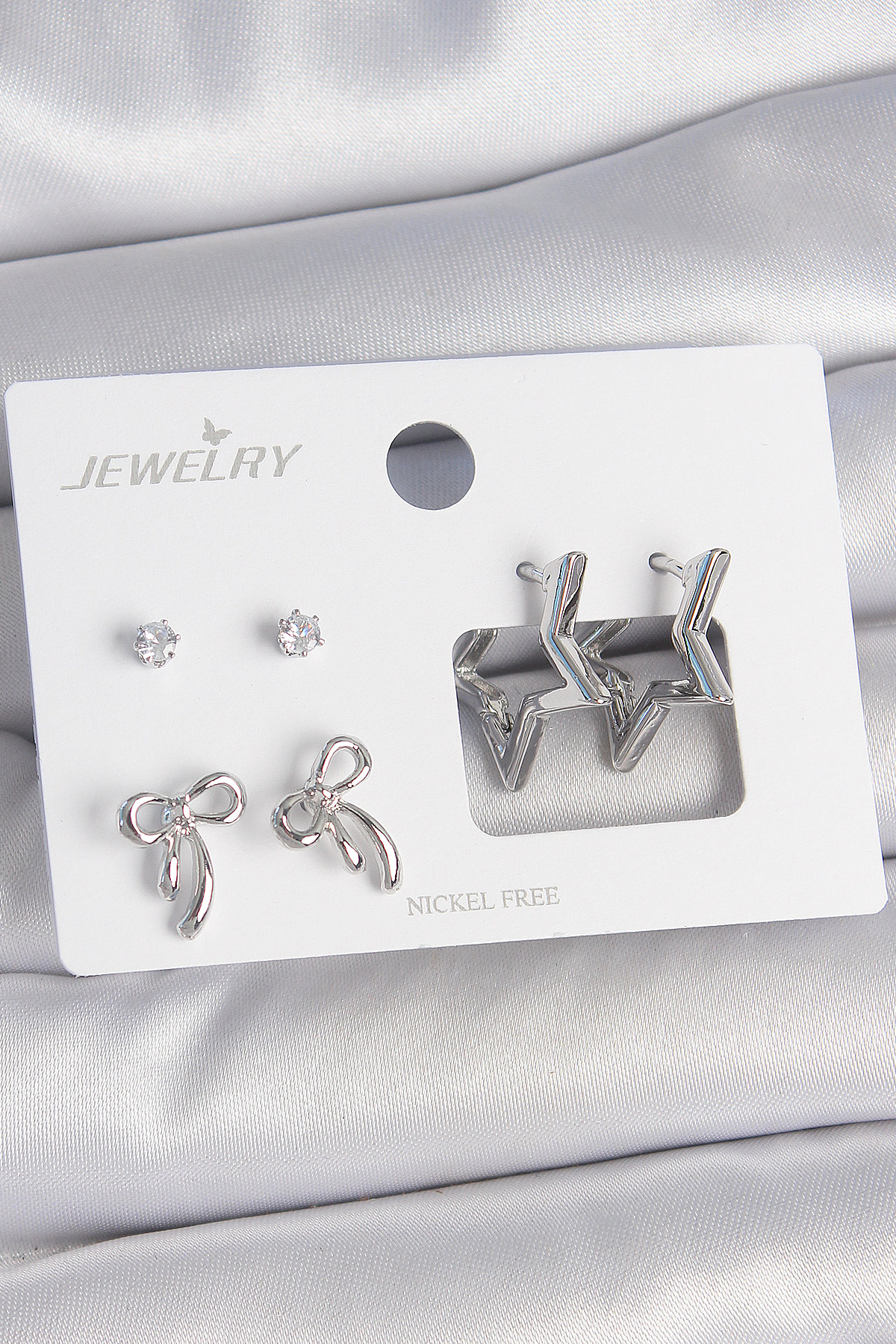 Pirinç Gümüş Renk Zirkon Taşlı Yıldız Model Fiyonk Detay 3 Çift Kadın Küpe Seti - TJ-BKP10606