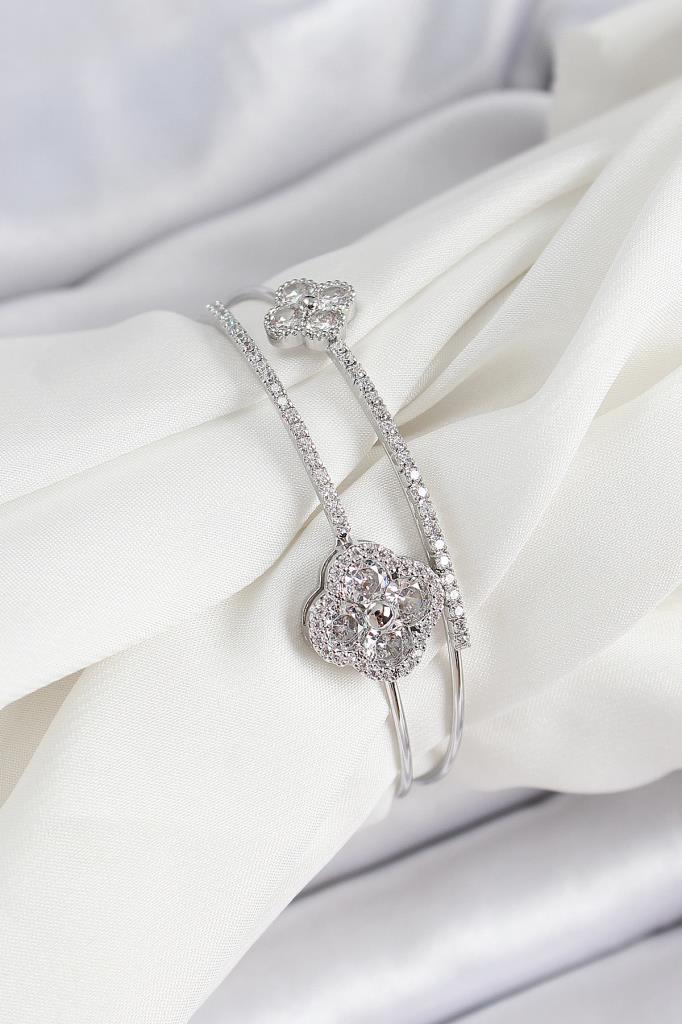 Pirinç Gümüş Renk Zirkon Taşlı Yonca Model 2'li Kadın Bileklik - BB7063