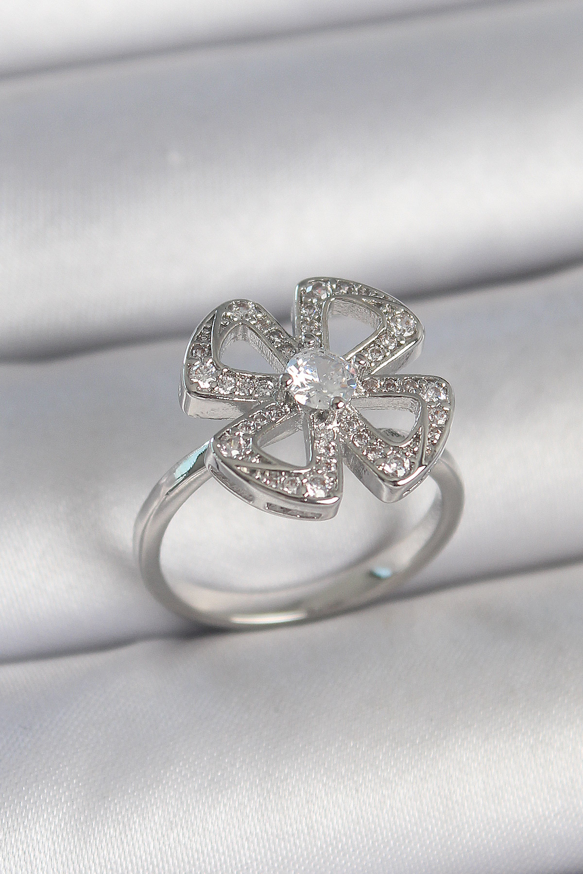 Pirinç Gümüş Renk Zirkon Taşlı Yonca Model Ayarlanabilir Kadın Yüzük - TJ-BYK3718