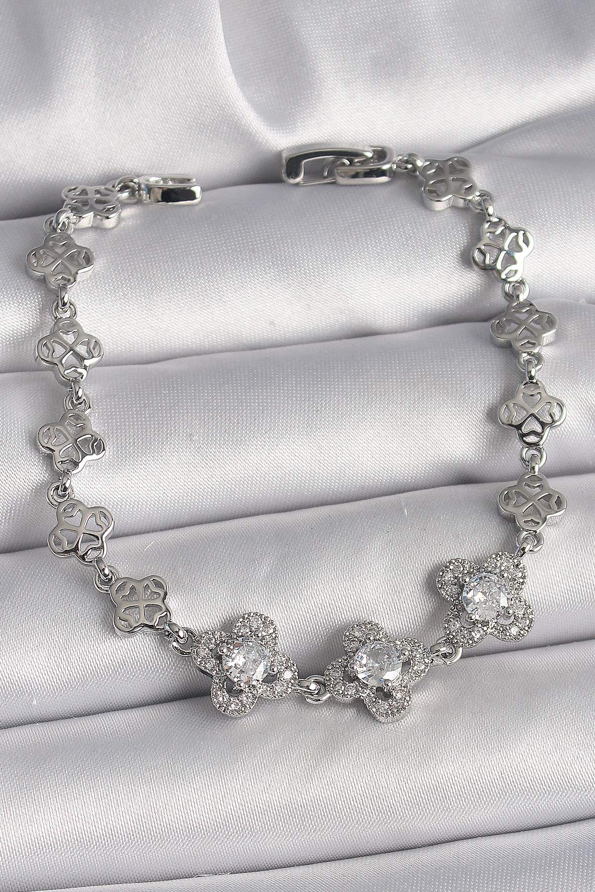 Pirinç Gümüş Renk Zirkon Taşlı Yonca Model Kadın Bileklik - TJ-BB6813