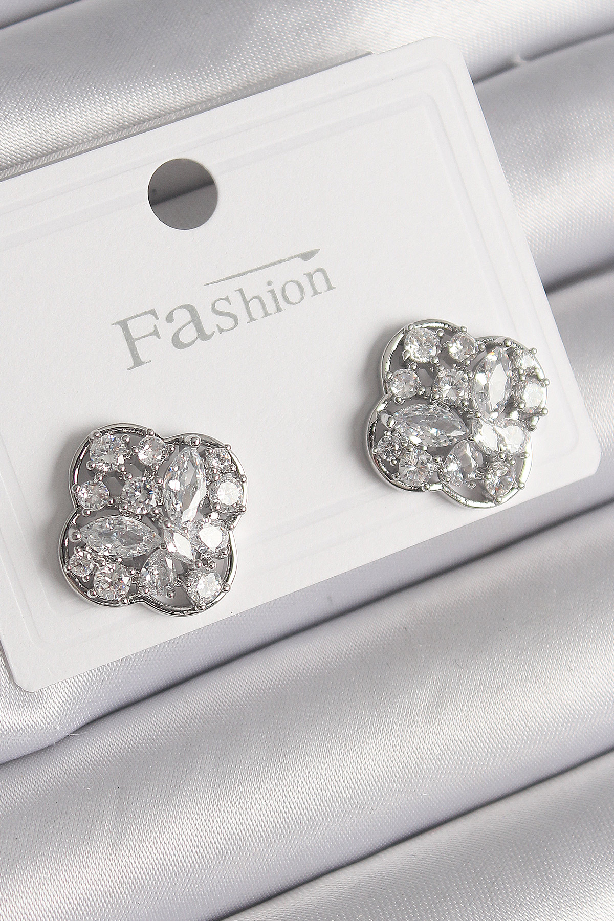 Pirinç Gümüş Renk Zirkon Taşlı Yonca Model Kadın Küpe - TJ-BKP9763