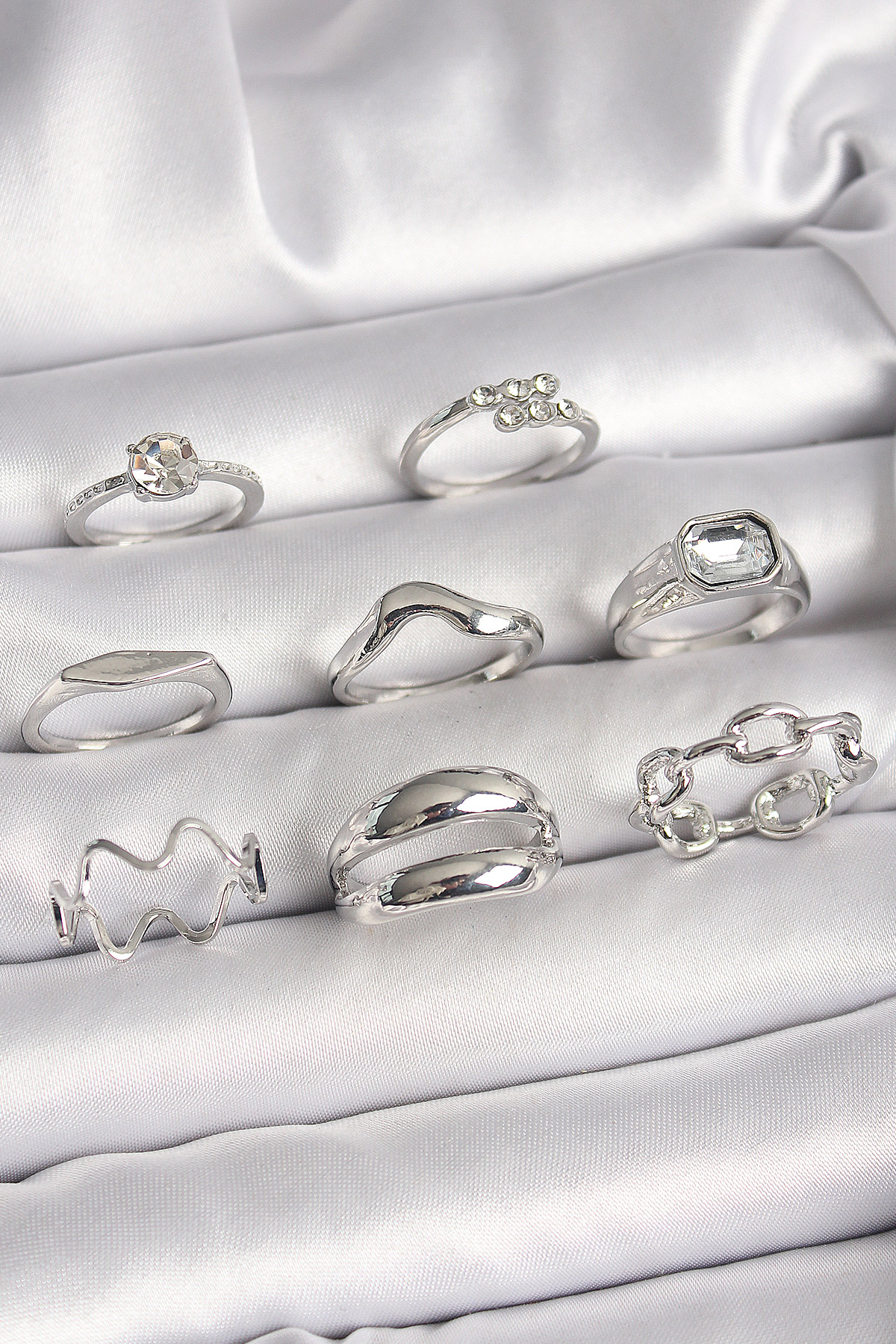 Pirinç Gümüş Renk Zirkon Taşlı Zincir Model Detay Kadın Yüzük Kombini - TJ-BYK3647
