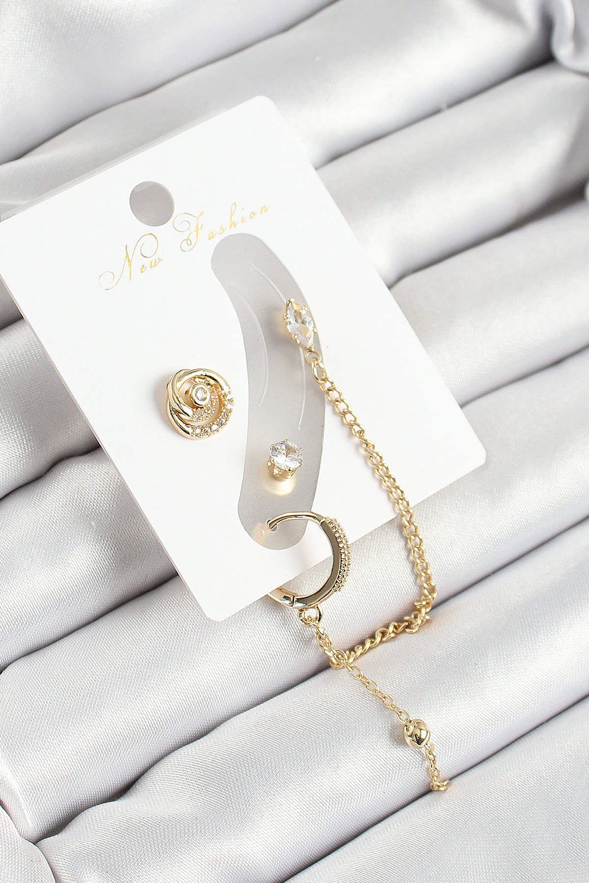 Pirinç Halka Figürlü Zirkon Taşlı Gold Renk 3'lü Kıkırdak Kadın Küpe Set - TJ-BKP10671