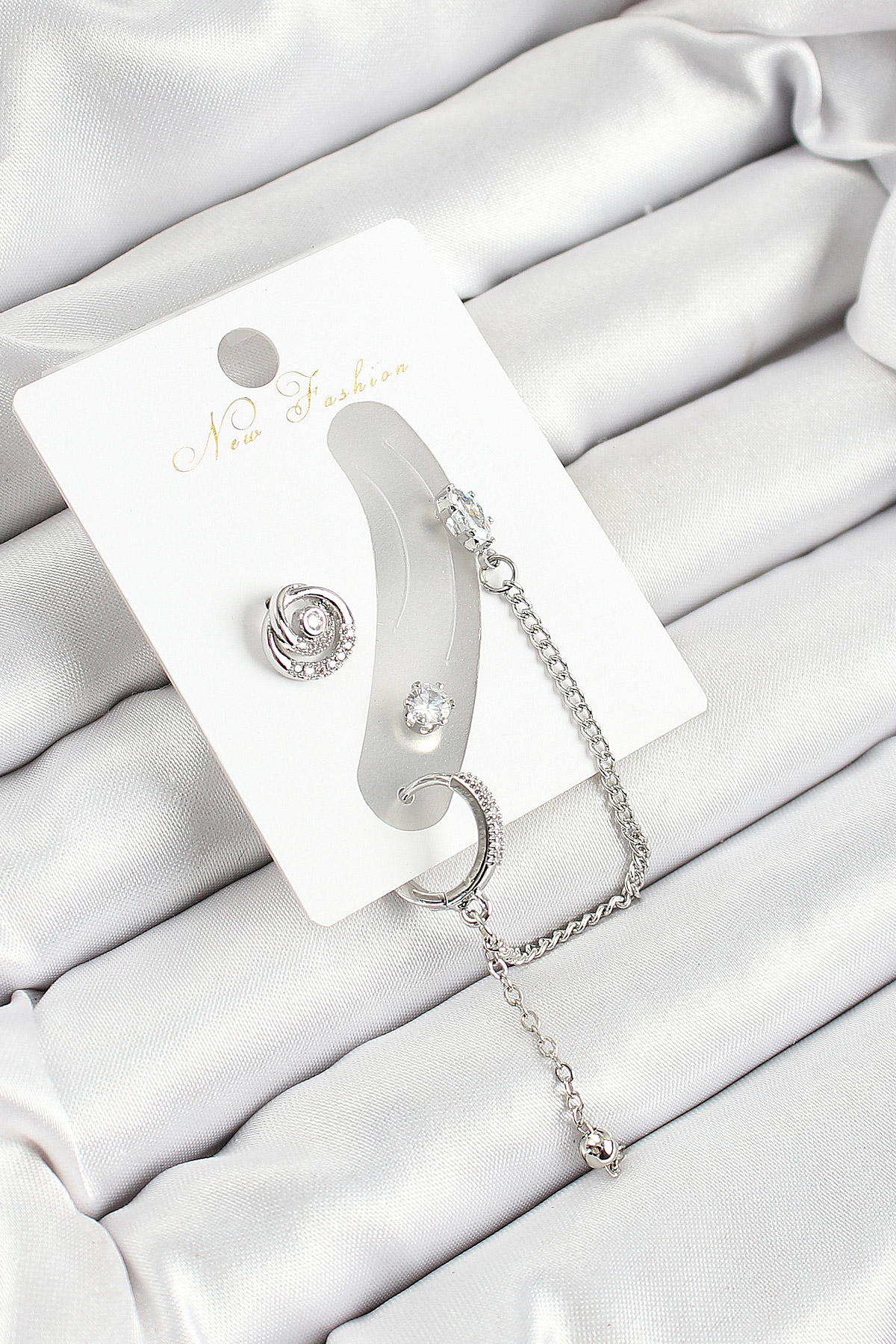 Pirinç Halka Figürlü Zirkon Taşlı Gümüş Renk 3'lü Kıkırdak Kadın Küpe Set - TJ-BKP10662