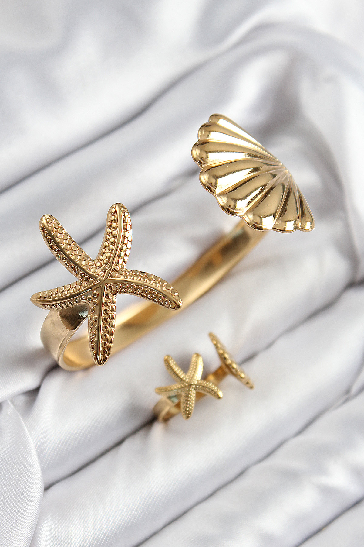 Pirinç İstiridye Ve Deniz Yıldızı Model Gold Renk Bileklik Yüzük Set - TJ-BB7601