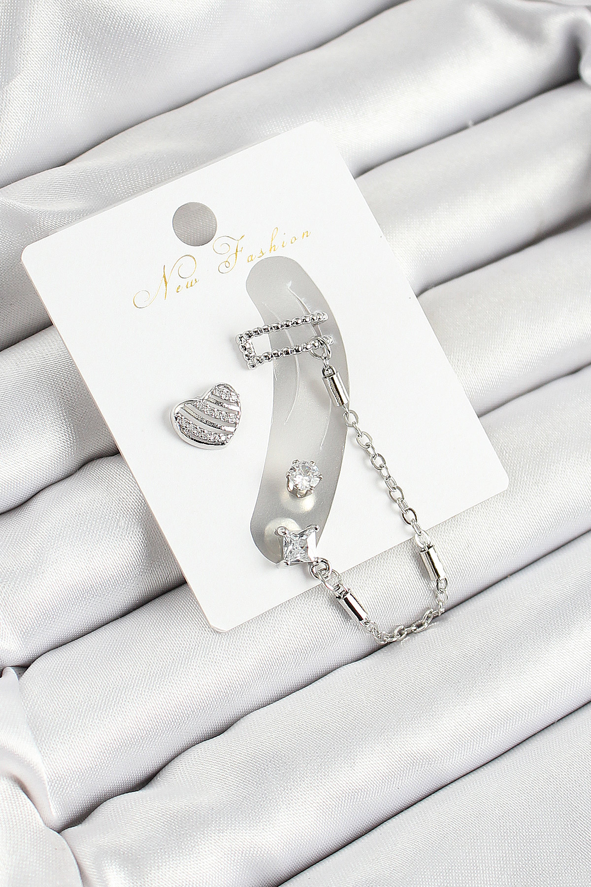 Pirinç Kalp Figürlü Zirkon Taşlı Gümüş Renk 3'lü Kıkırdak Kadın Küpe Set - TJ-BKP10661