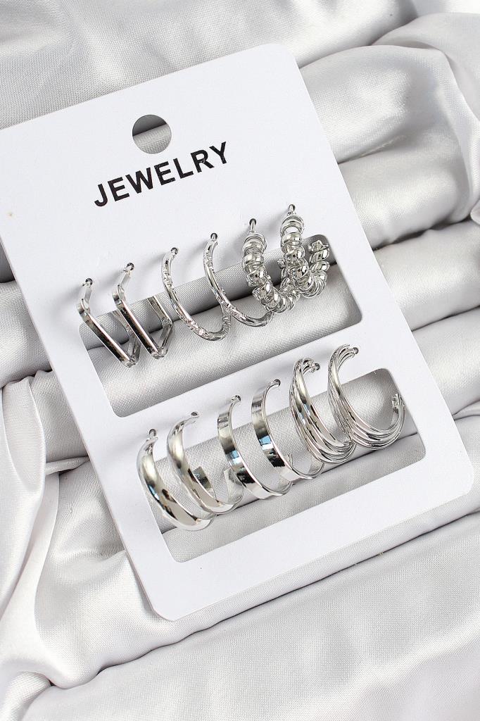 Pirinç Karışık Halka Model Gümüş Renk 6 Çift Kadın Küpe Set - BKP10888