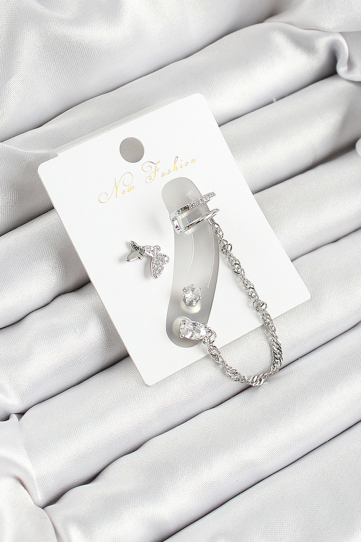 Pirinç Kelebek Figürlü Zirkon Taşlı Gümüş Renk 3'lü Kıkırdak Kadın Küpe Set - TJ-BKP10659