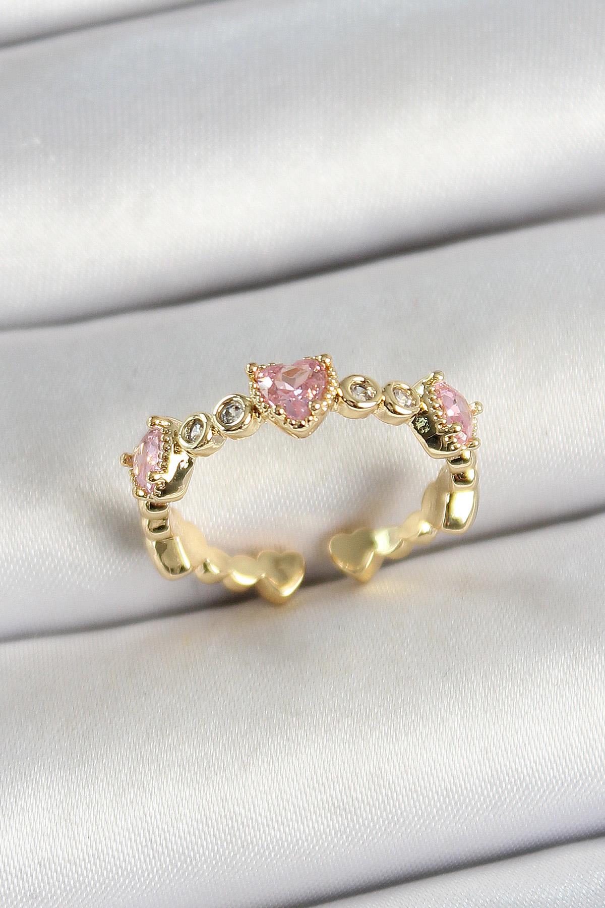 Pirinç Sıralı Kalp Figürlü Zirkon Taşlı Gold Renk Ayarlanabilir Kadın Yüzük - TJ-BYK3756