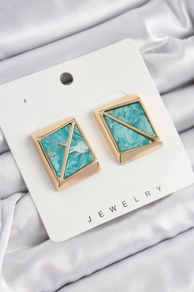 Pirinç Turkuaz Üçgen Kesim Detaylı Kare Model Vintage Gold Renk Kadın Küpe - BKP10873