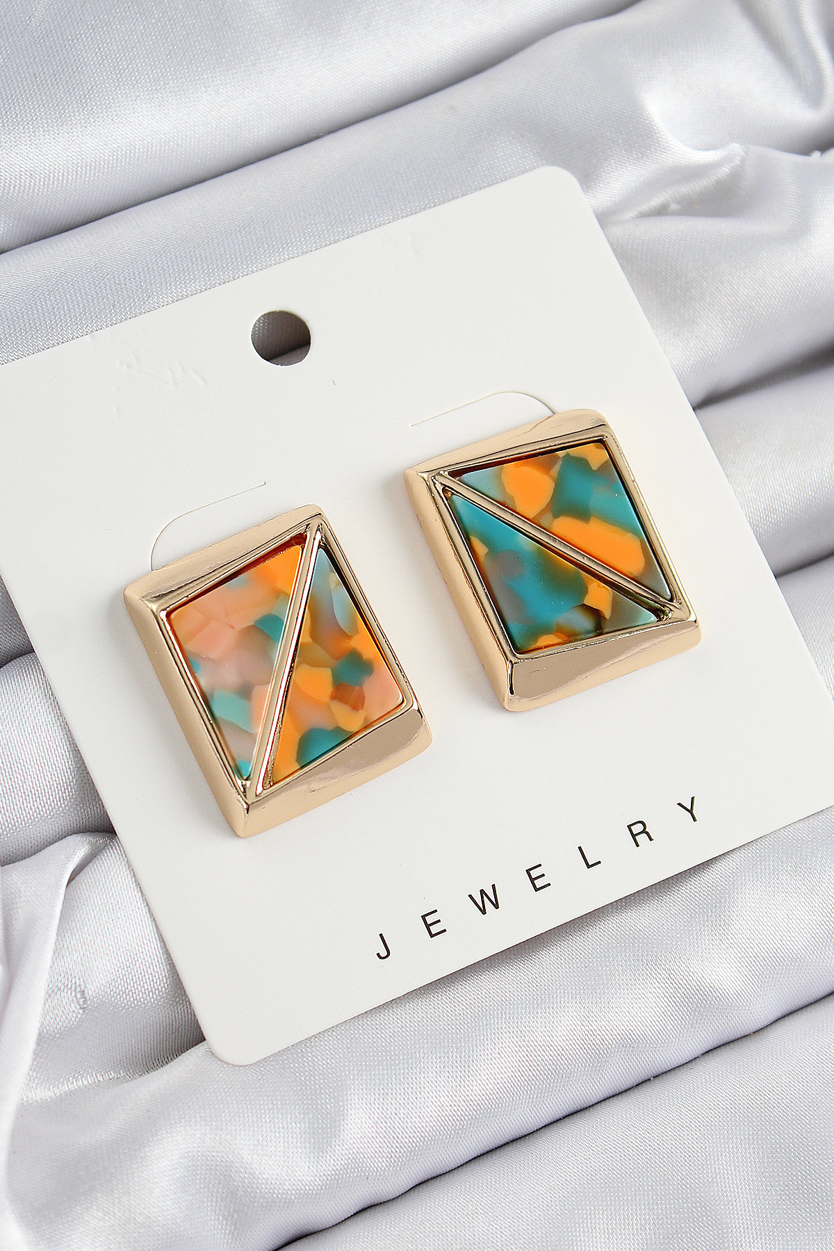 Pirinç Turuncu Yeşil Üçgen Kesim Detaylı Kare Model Vintage Gold Renk Kadın Küpe - TJ-BKP10872