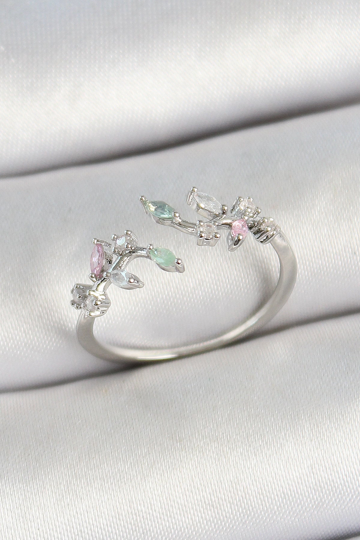 Pirinç Yaprak Figürlü Zirkon Taşlı Gümüş Renk Ayarlanabilir Kadın Yüzük - TJ-BYK3769