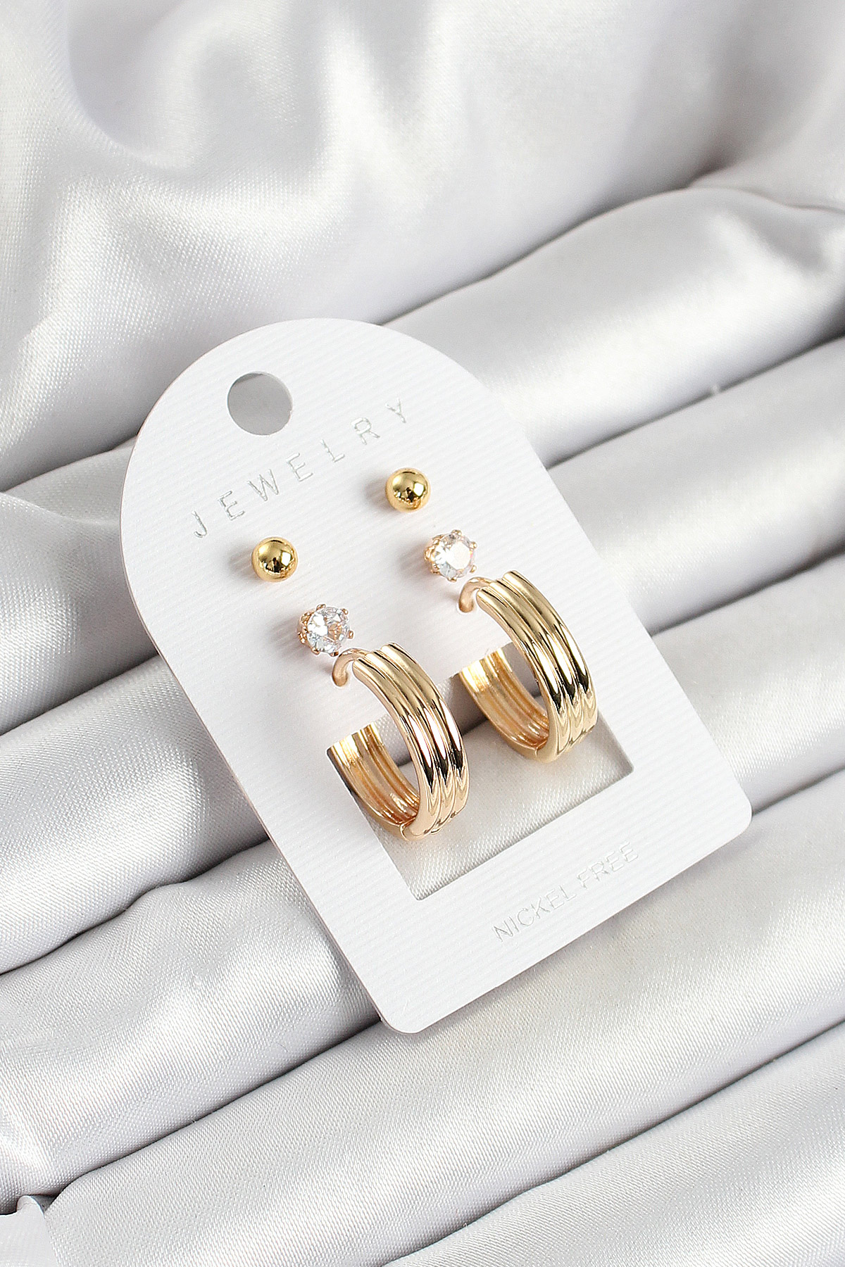 Pirinç Zirkon Taş Ve Halka Figürlü Gold Renk 3'lü Çift Kadın Küpe Set - TJ-BKP10655