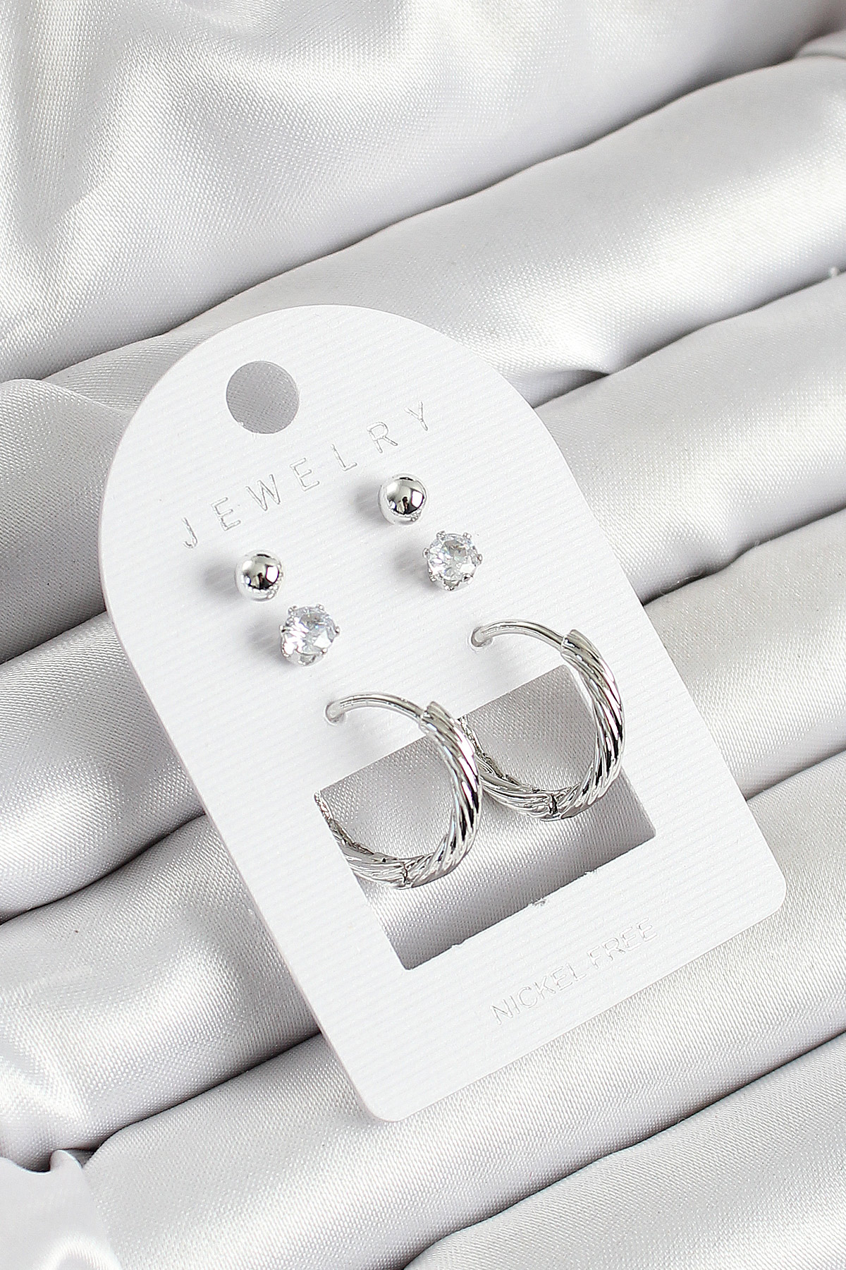 Pirinç Zirkon Taş Ve Halka Figürlü Gümüş Renk 3'lü Çift Kadın Küpe Set - TJ-BKP10646