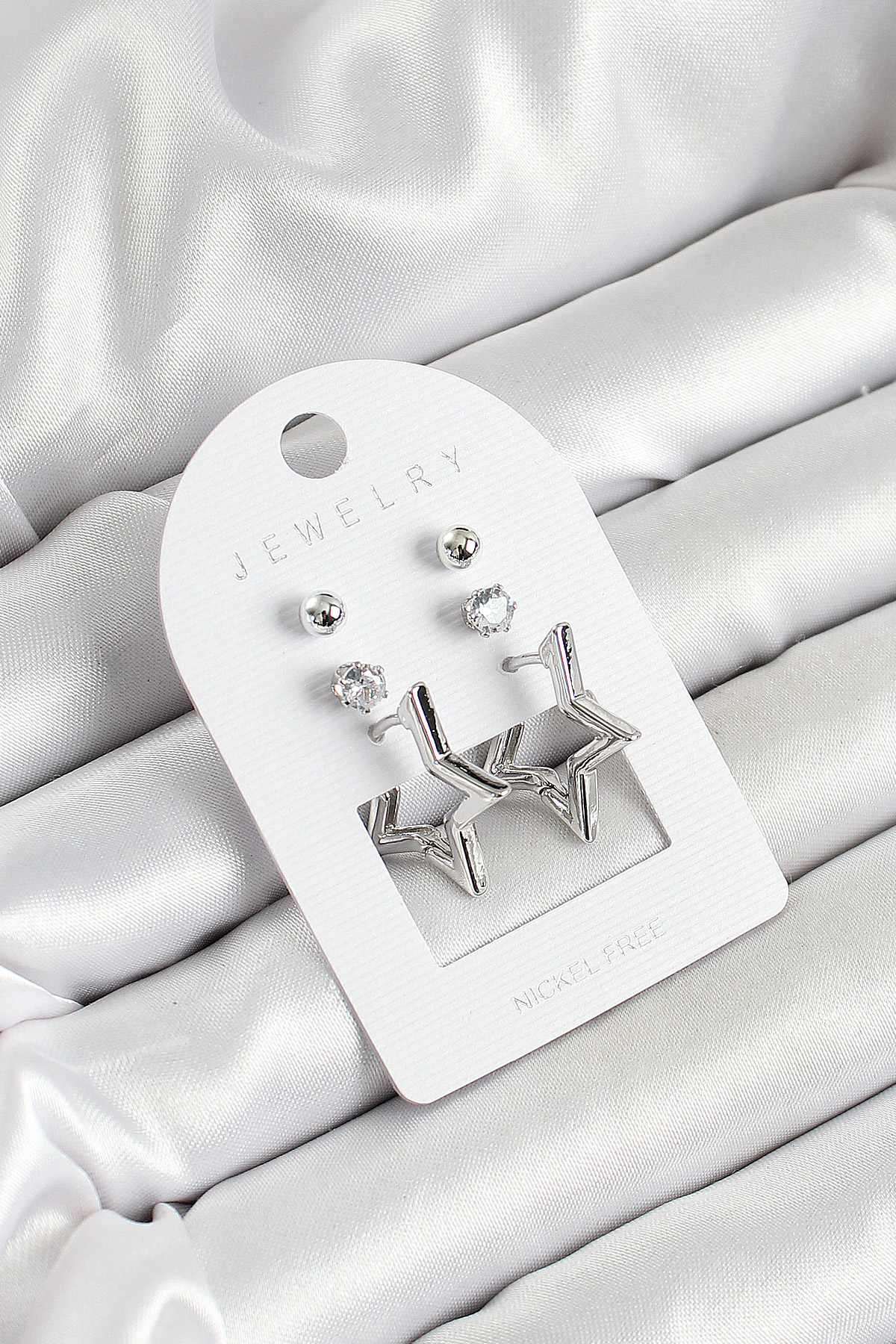 Pirinç Zirkon Taş Ve Yıldız Figürlü Gümüş Renk 3'lü Çift Kadın Küpe Set - TJ-BKP10647