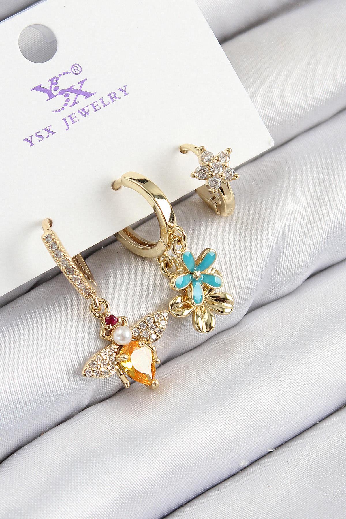 Pirinç Zirkon Taşlı 3'lü Arı Ve Çiçek Model Gold Renk Kadın Küpe - BKP11143