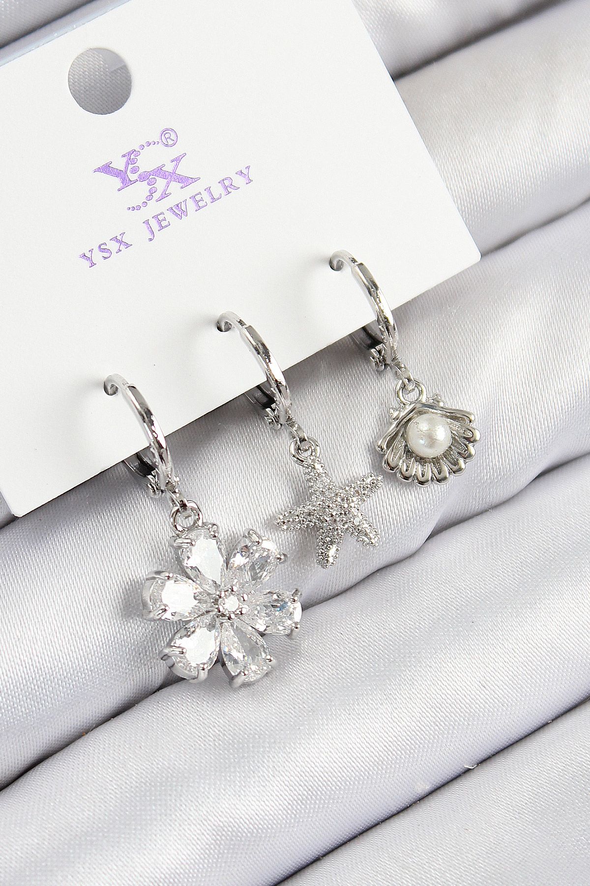 Pirinç Zirkon Taşlı 3'lü Çiçek Ve İstiridye Model Gümüş Renk Kadın Küpe - TJ-BKP11129