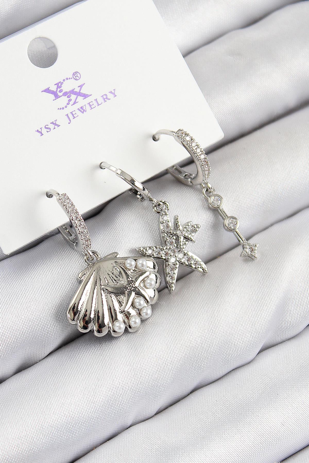 Pirinç Zirkon Taşlı 3'lü Yıldız Ve İstiridye Model Gümüş Renk Kadın Küpe - BKP11131