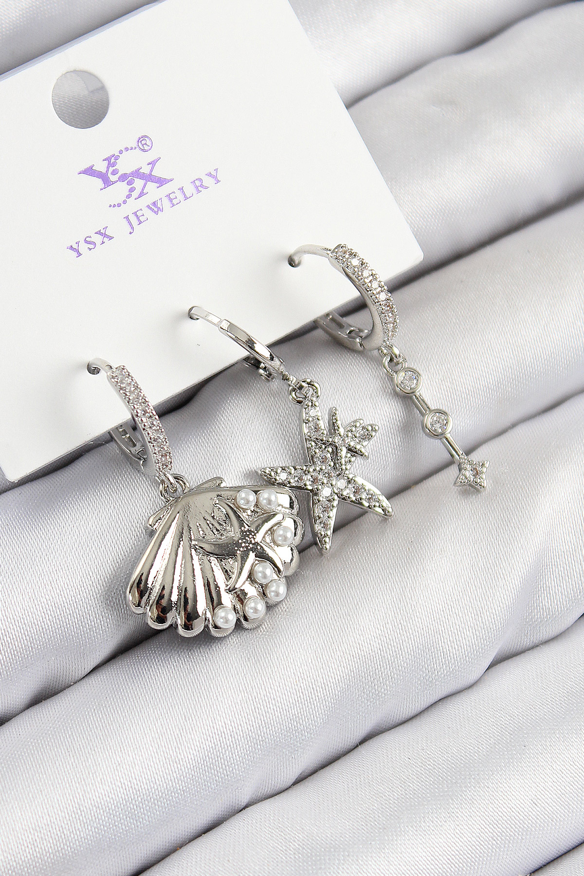 Pirinç Zirkon Taşlı 3'lü Yıldız Ve İstiridye Model Gümüş Renk Kadın Küpe - TJ-BKP11131