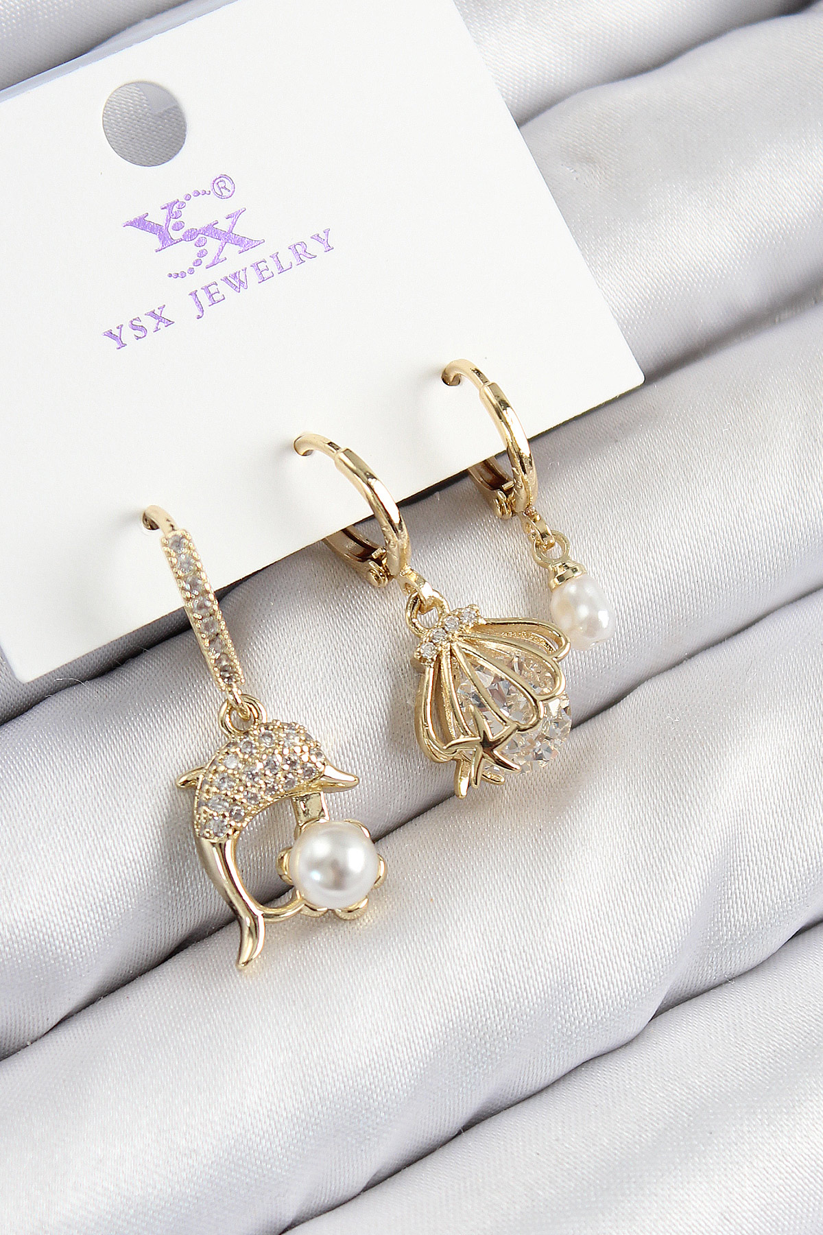 Pirinç Zirkon Taşlı 3'lü Yunus Balığı Ve İstiridye Model Gold Renk Kadın Küpe - TJ-BKP11139